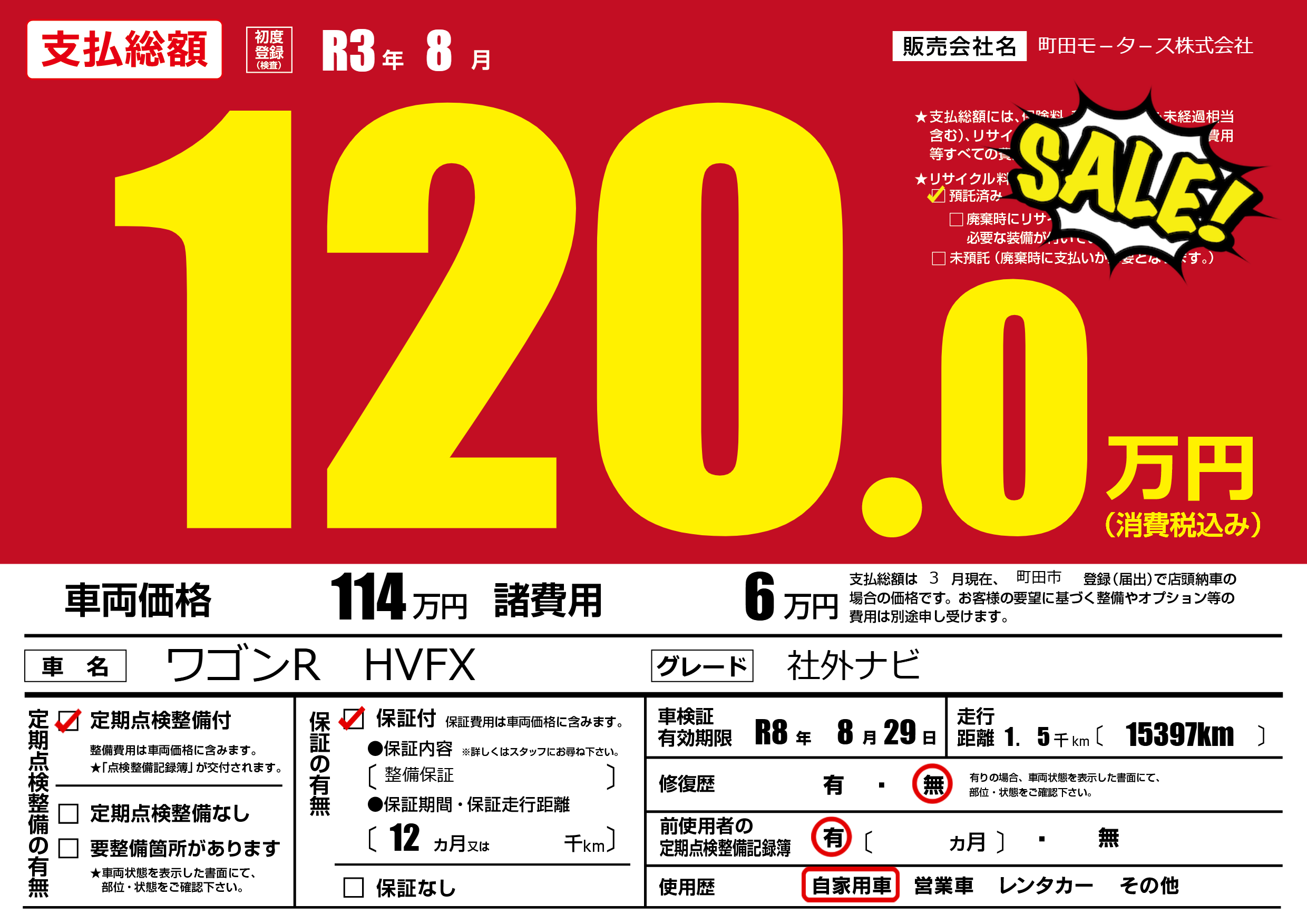 | 走行キロ | 0.1万km | 初年度登録 | R3年8月 |