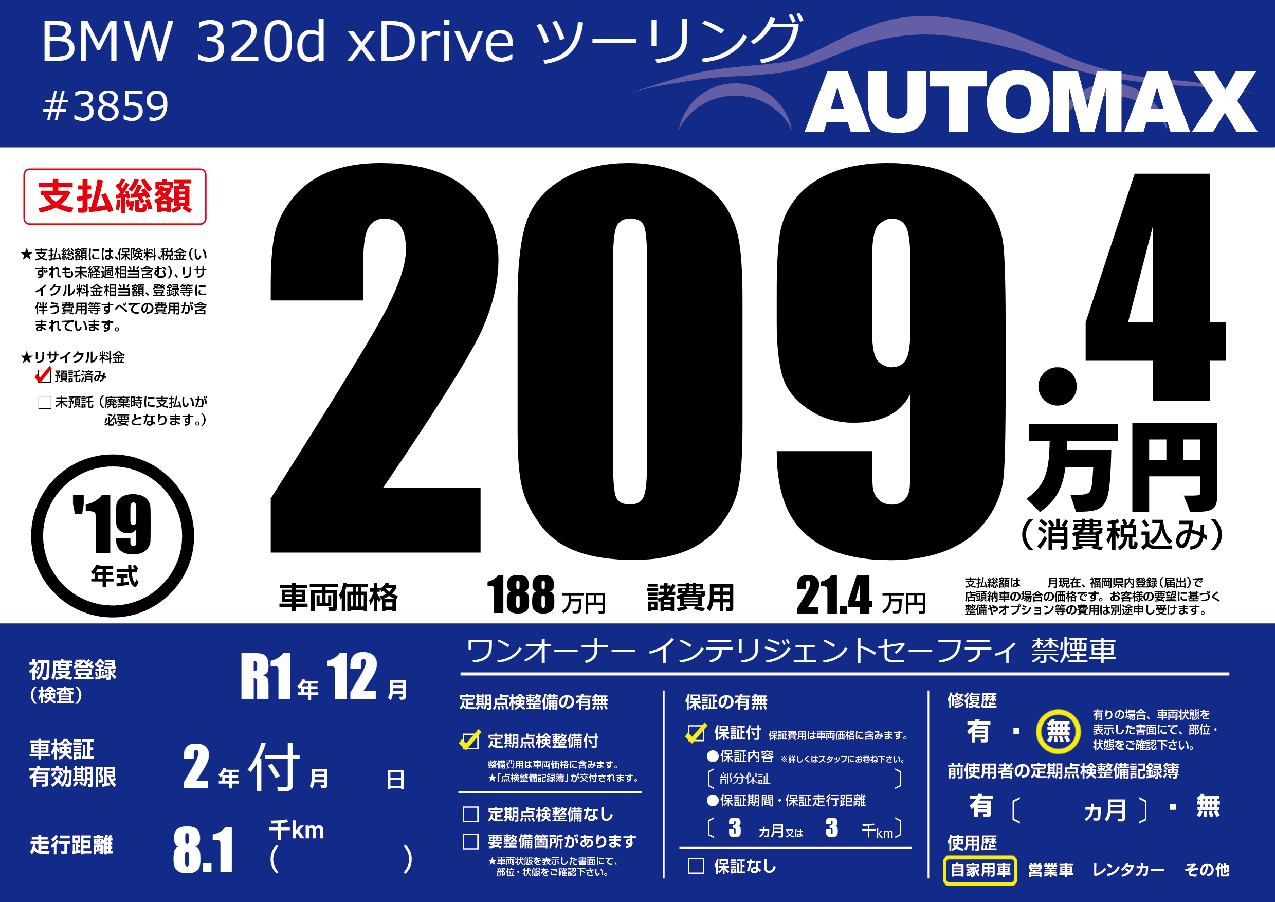 | 車名 | BMW 320d xDrive ツーリング | グレード ミッション 排気量 |
