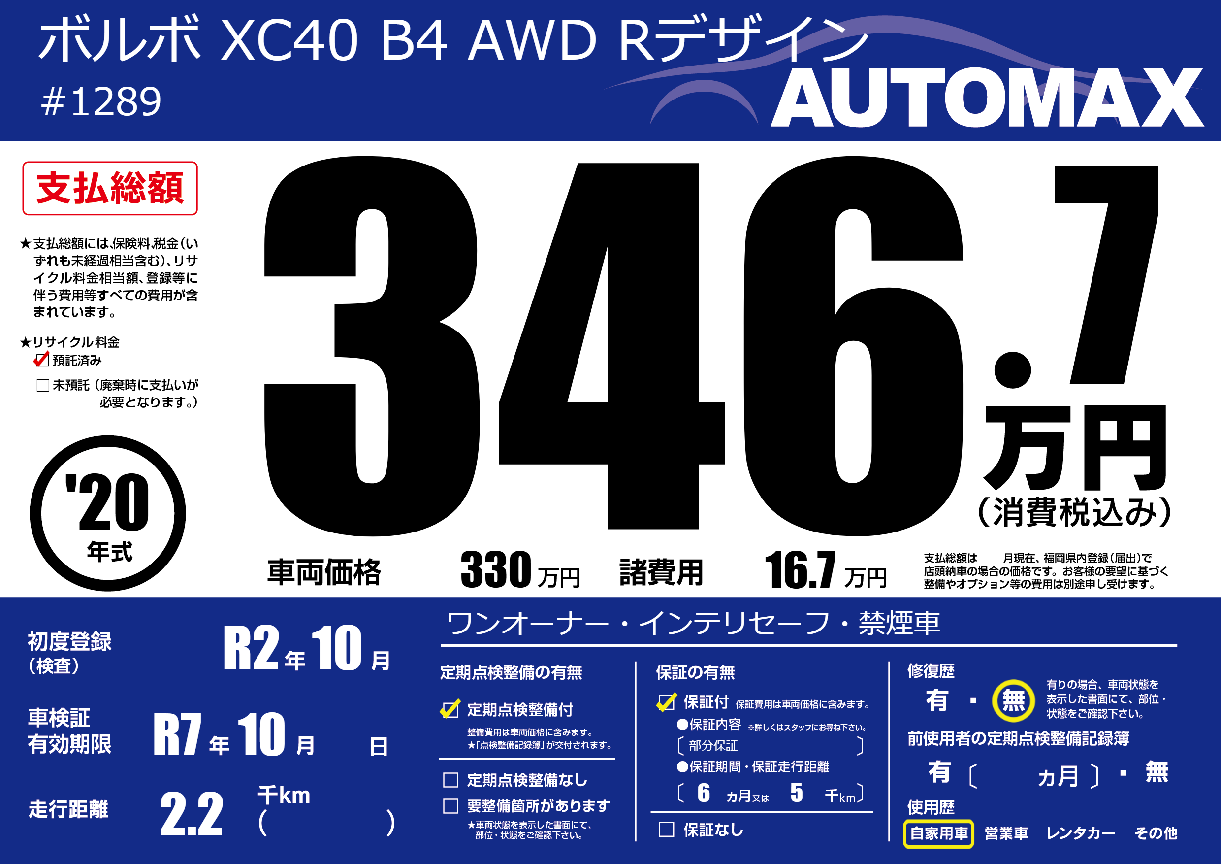 | 車名 | ボルボ XC40 B4 AWD Rデザイン | グレード ミッション 排気量 |