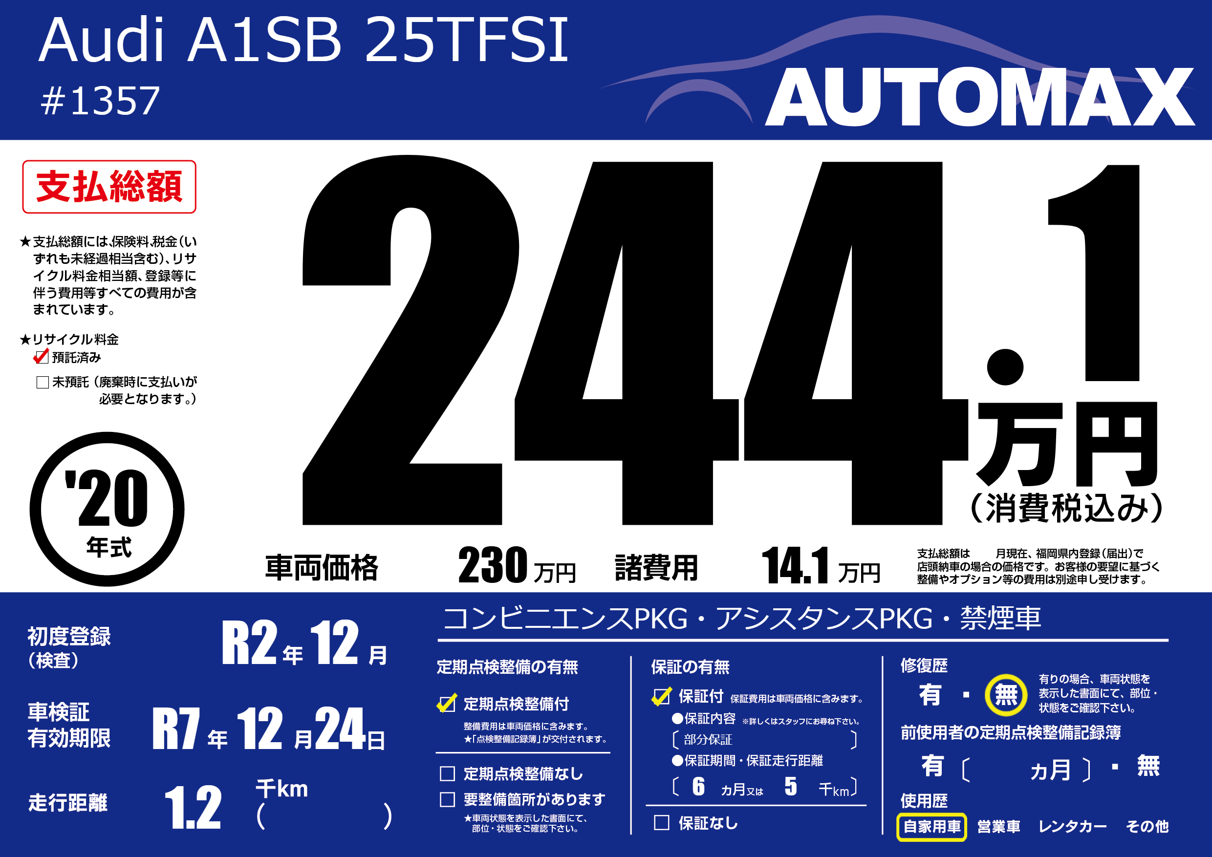 | 車名 | Audi A1SB 25TFSI | グレード ミッション 排気量 |