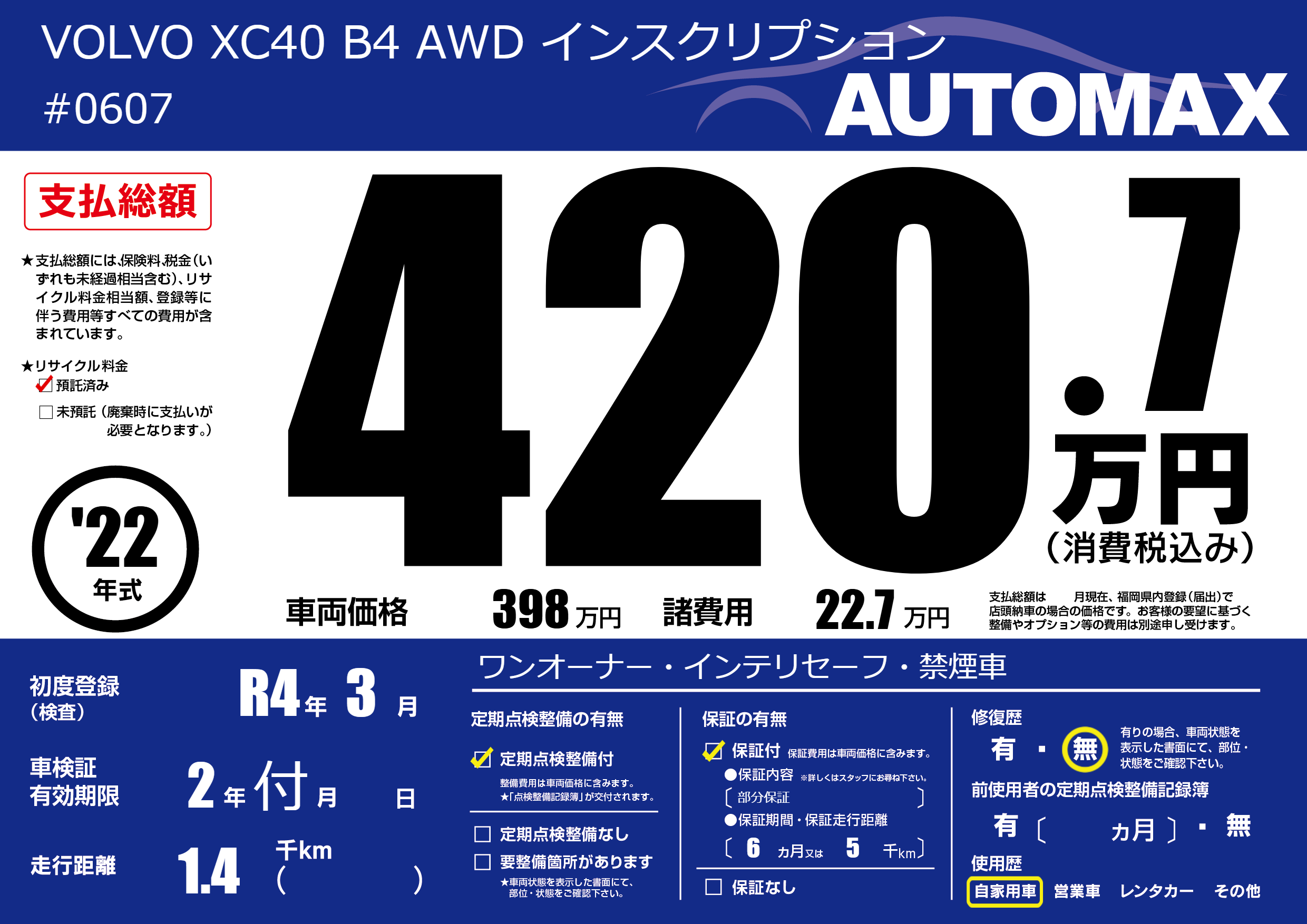 | 車名 | VOLVO XC40 B4 AWD インスクリプション | グレード ミッション 排気量 |