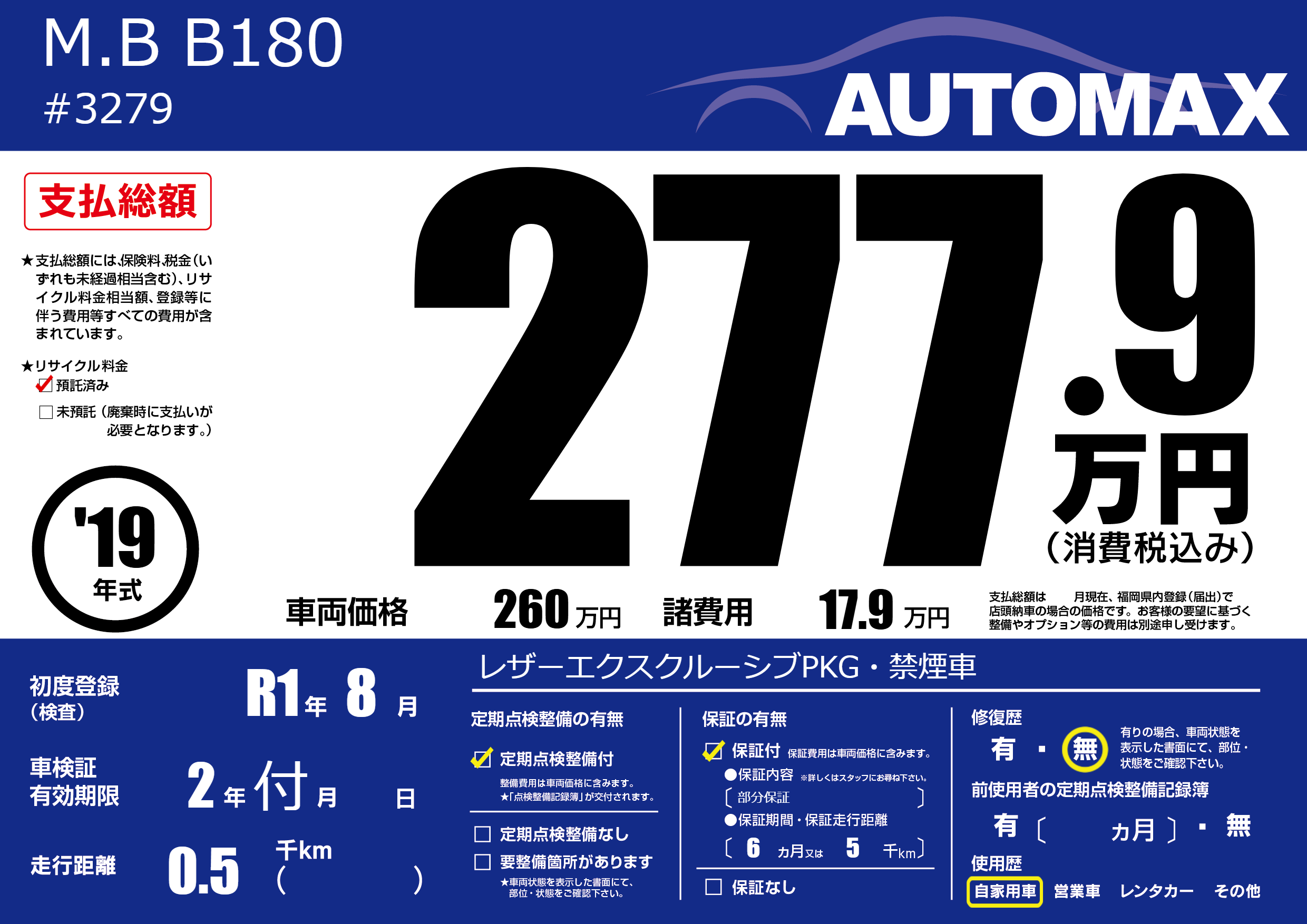 | 車名 | M.B B180 | グレード ミッション 排気量 |