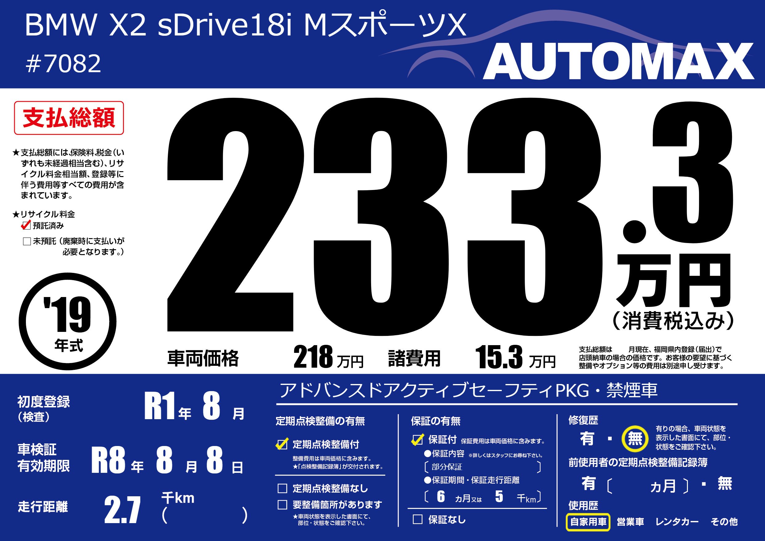 | 車名 | BMW X2 sDrive18i MスポーツX | グレード ミッション 排気量 |
