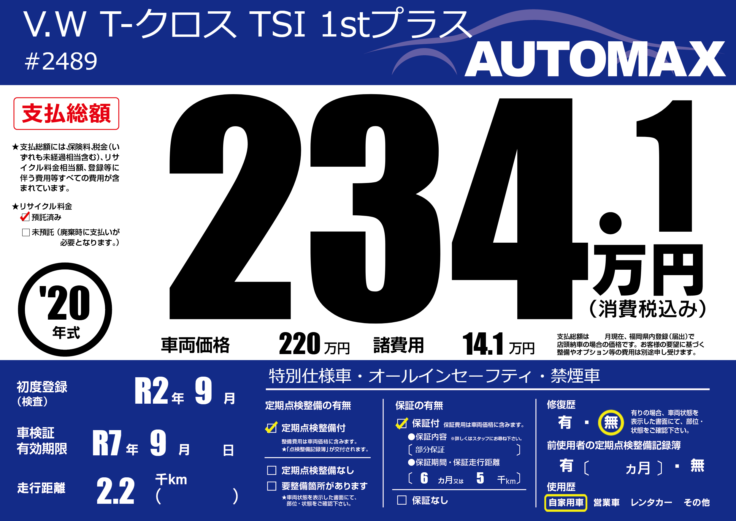 | 車名 | V.W T-クロス TSI 1stプラス | グレード ミッション 排気量 |