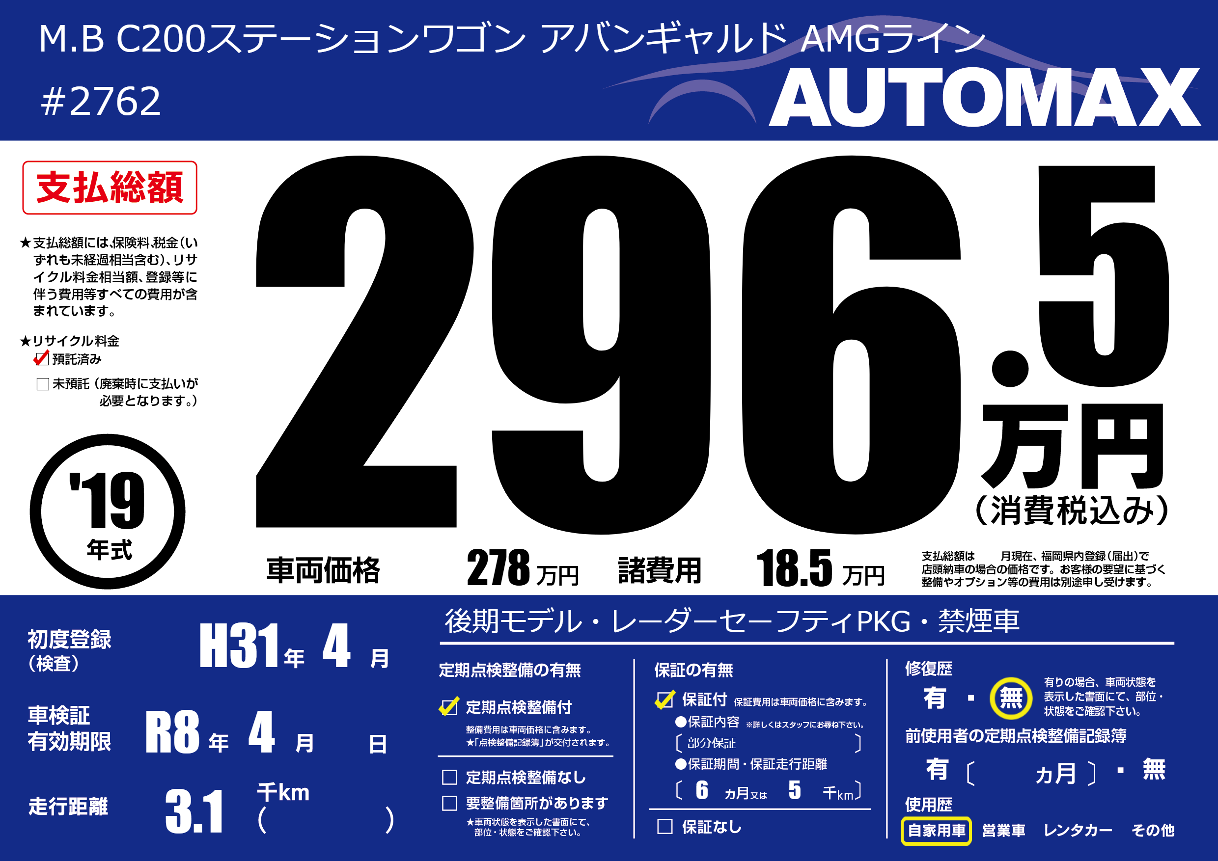 | 車名 | M.B C200ステーションワゴン アバンギャルド AMGライン | グレード ミッション 排気量 |