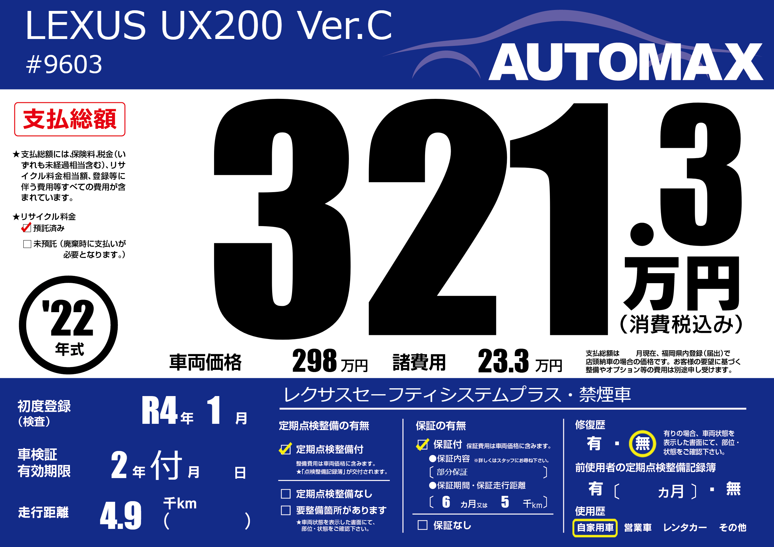 | 車名 | LEXUS UX200 Ver.C | グレード ミッション 排気量 |