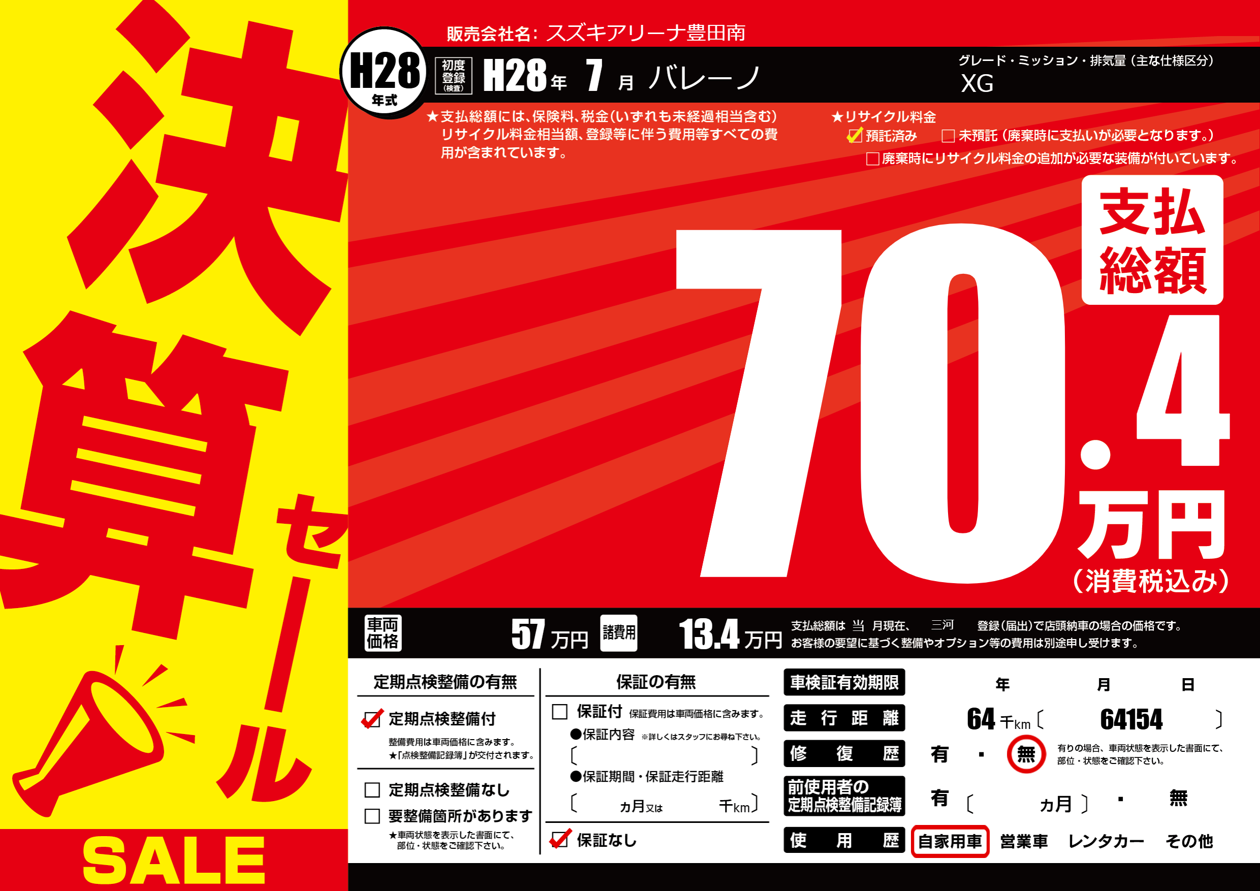 | 車名 | バレーノ | グレード ミッション 排気量 |