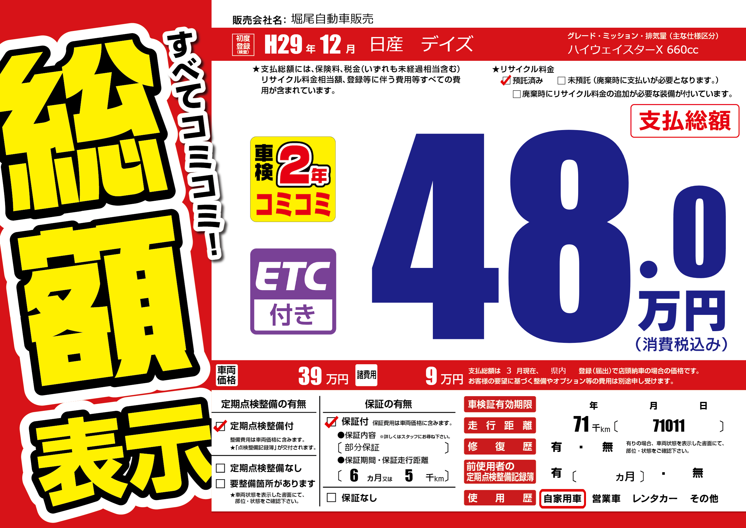 | 走行キロ | 7.1万km | 初年度登録 | H29年12月 |
