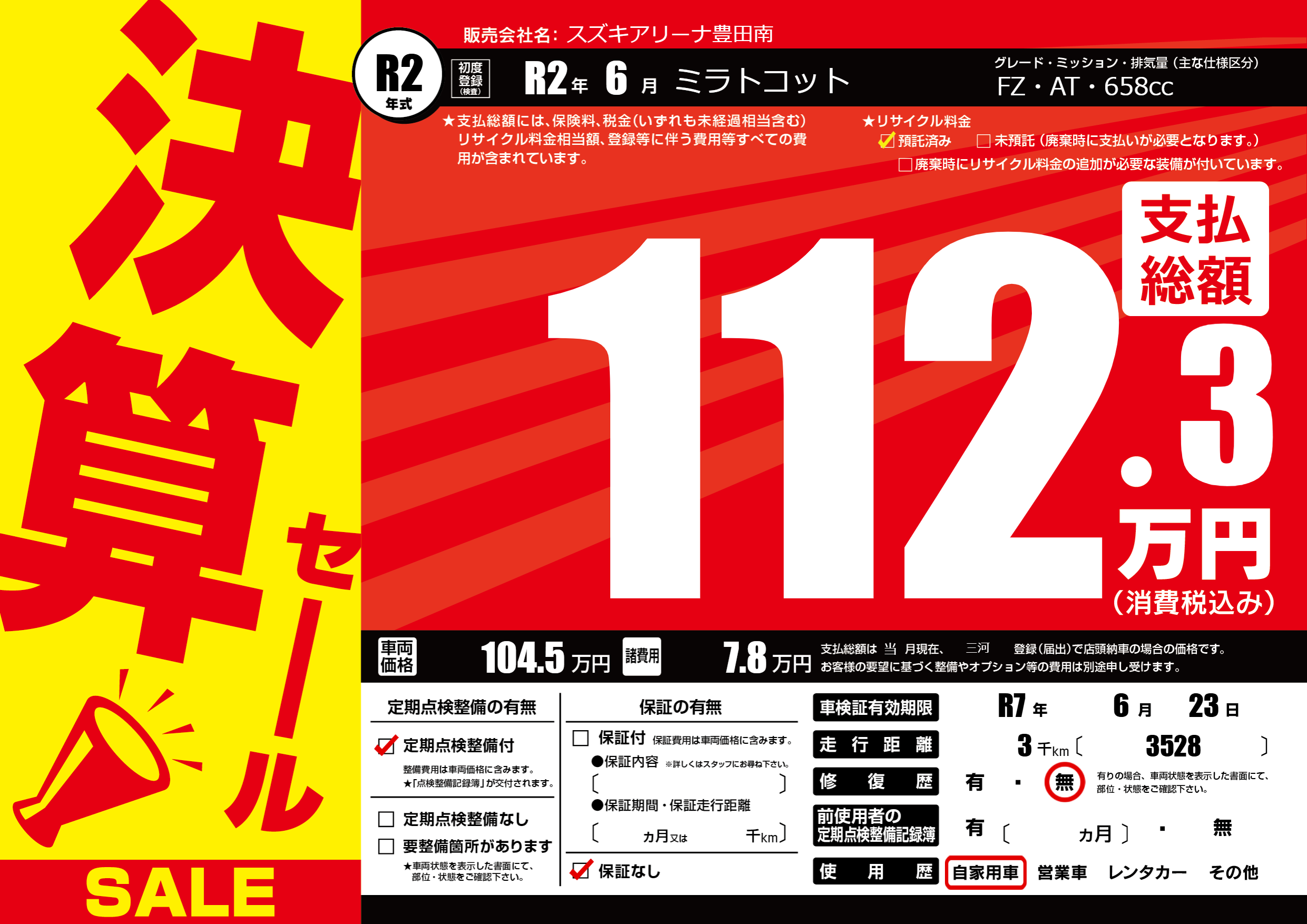 | 走行キロ | 0.3万km | 初年度登録 | R2年6月 |