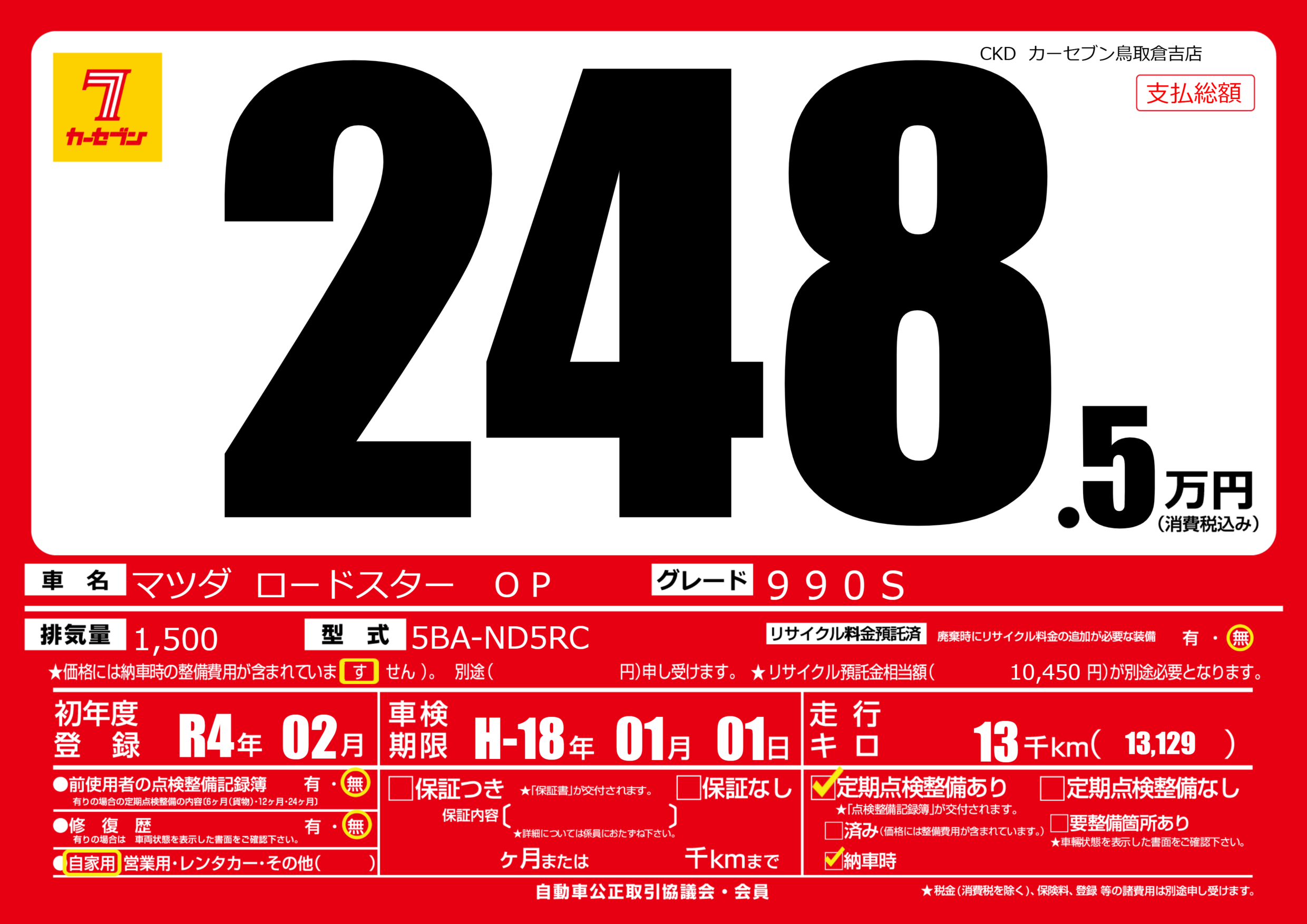| 走行キロ | 1.3万km | 初年度登録 | R4年02月 |