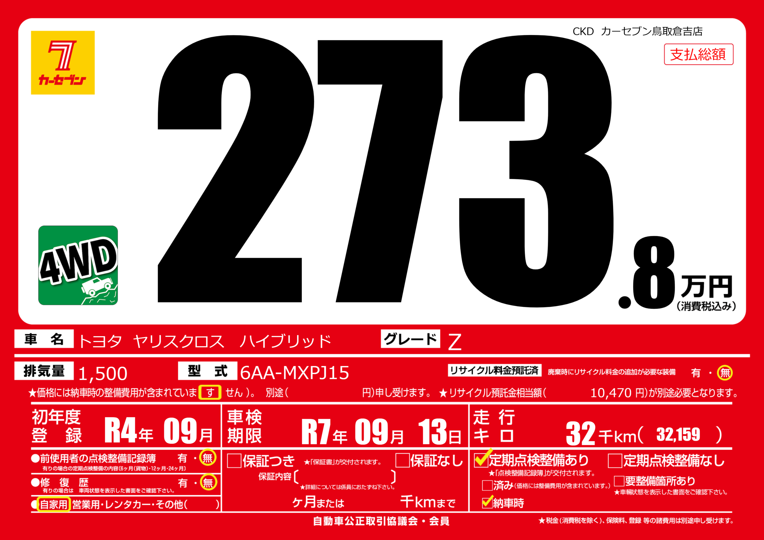 | 車名 | トヨタ ヤリスクロス ハイブリッド | グレード ミッション 排気量 |