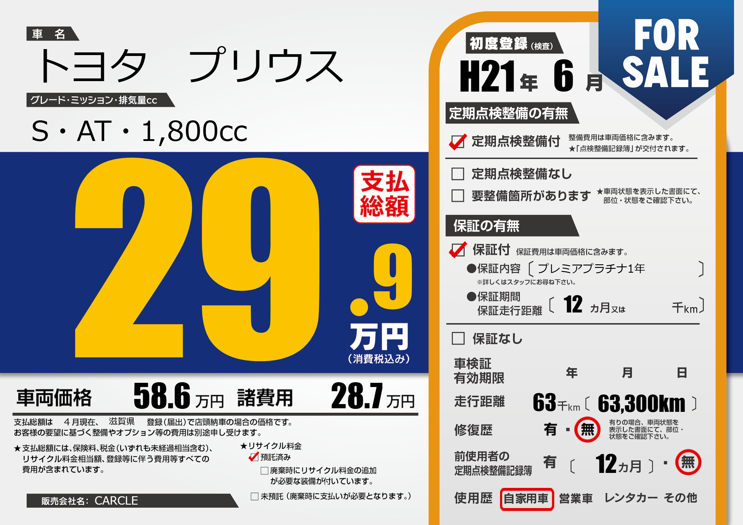 | 車名 | トヨタ プリウス | グレード ミッション 排気量 |
