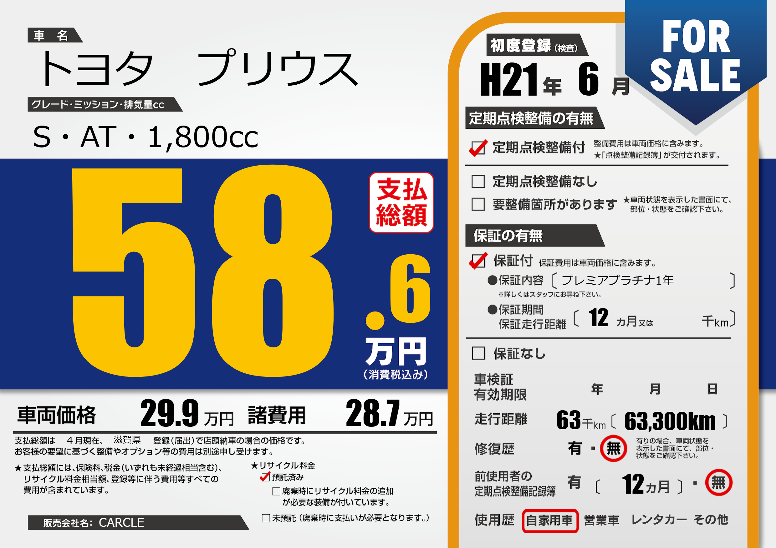 保証なし 保証内容(プレミアプラチナ1年) 12ヶ月または()千kmまで |