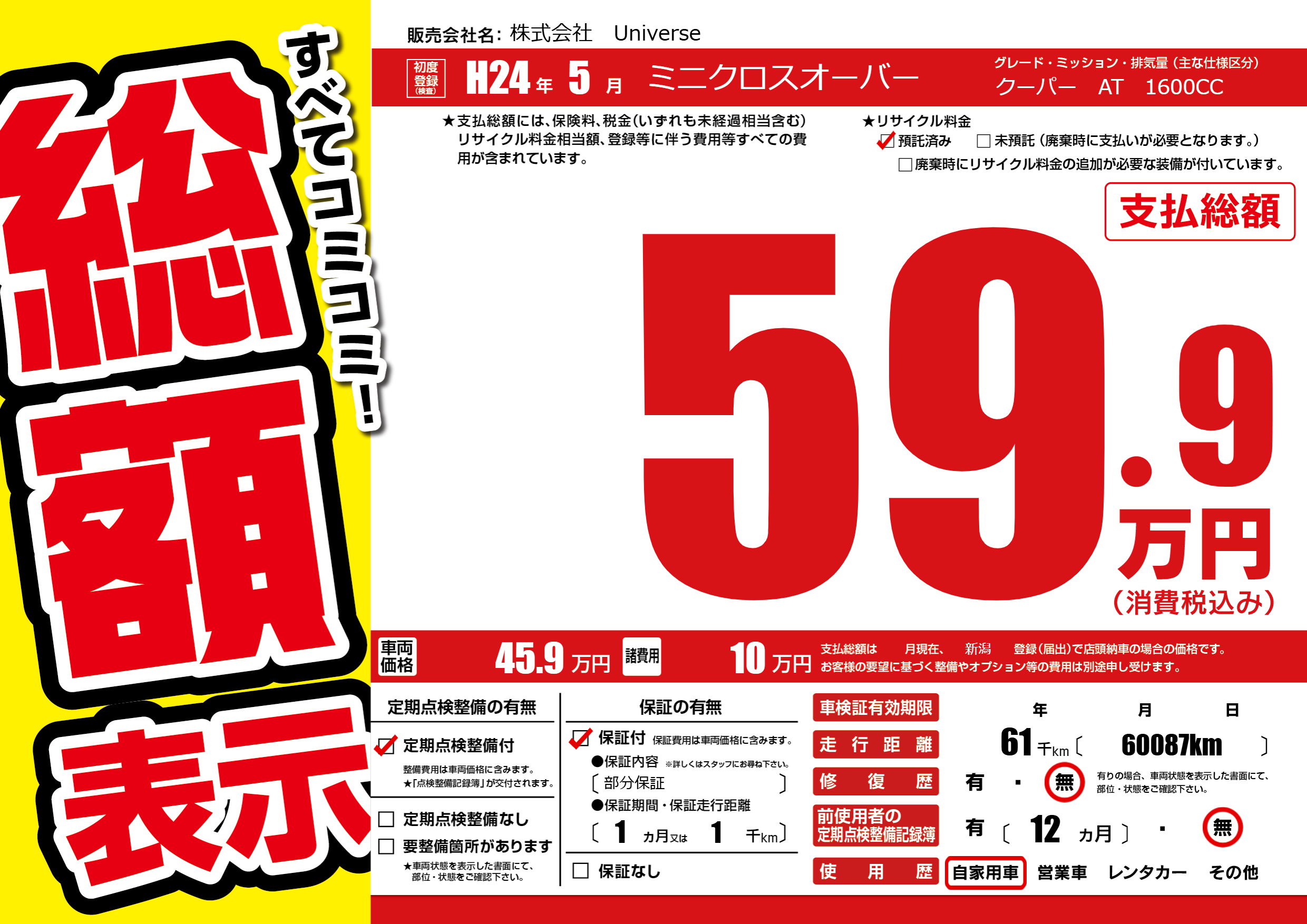 | 車名 | ミニクロスオーバー | グレード ミッション 排気量 |