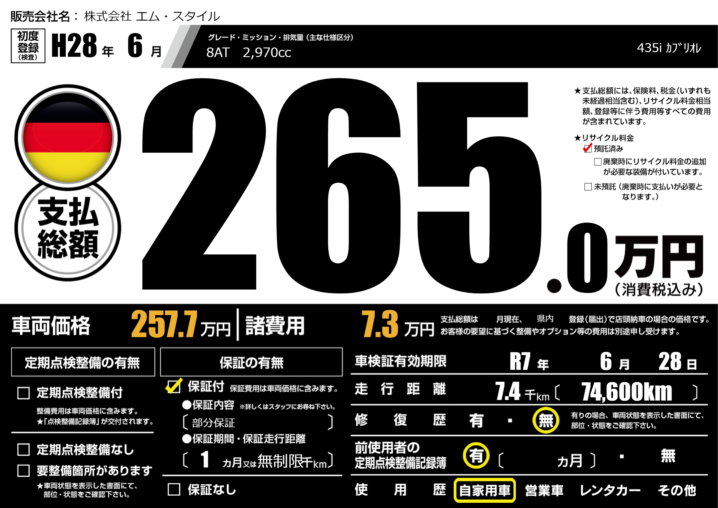 | 車名 | 435i カブリオレ | グレード ミッション 排気量 |