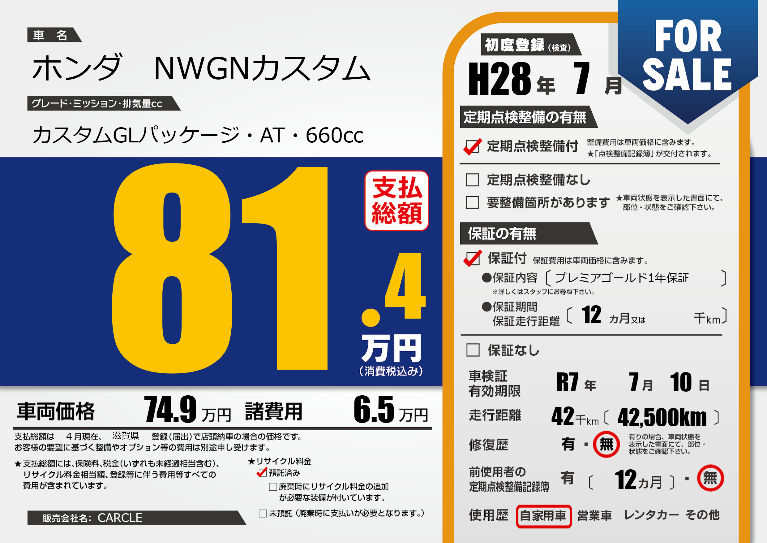 | 走行キロ | 4.2万km | 初年度登録 | H28年7月 |