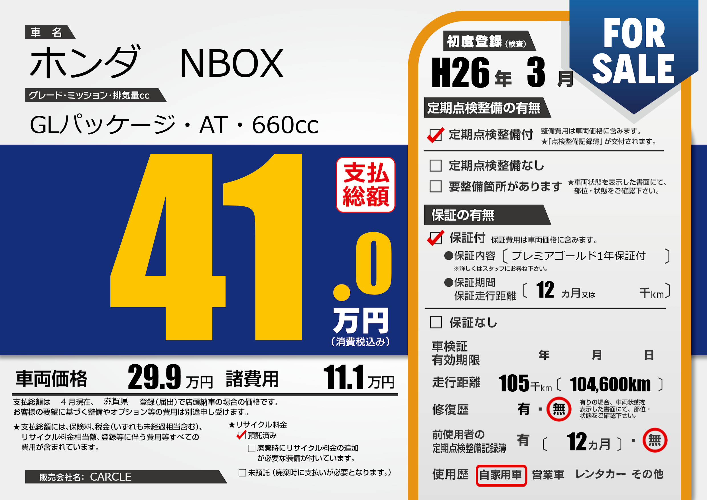 | 車名 | ホンダ NBOX | グレード ミッション 排気量 |
