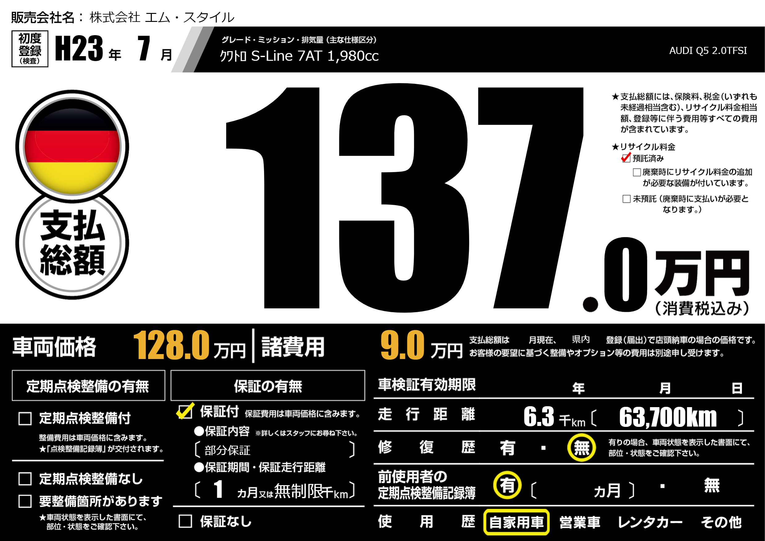 | 車名 | AUDI Q5 2.0TFSI | グレード ミッション 排気量 |