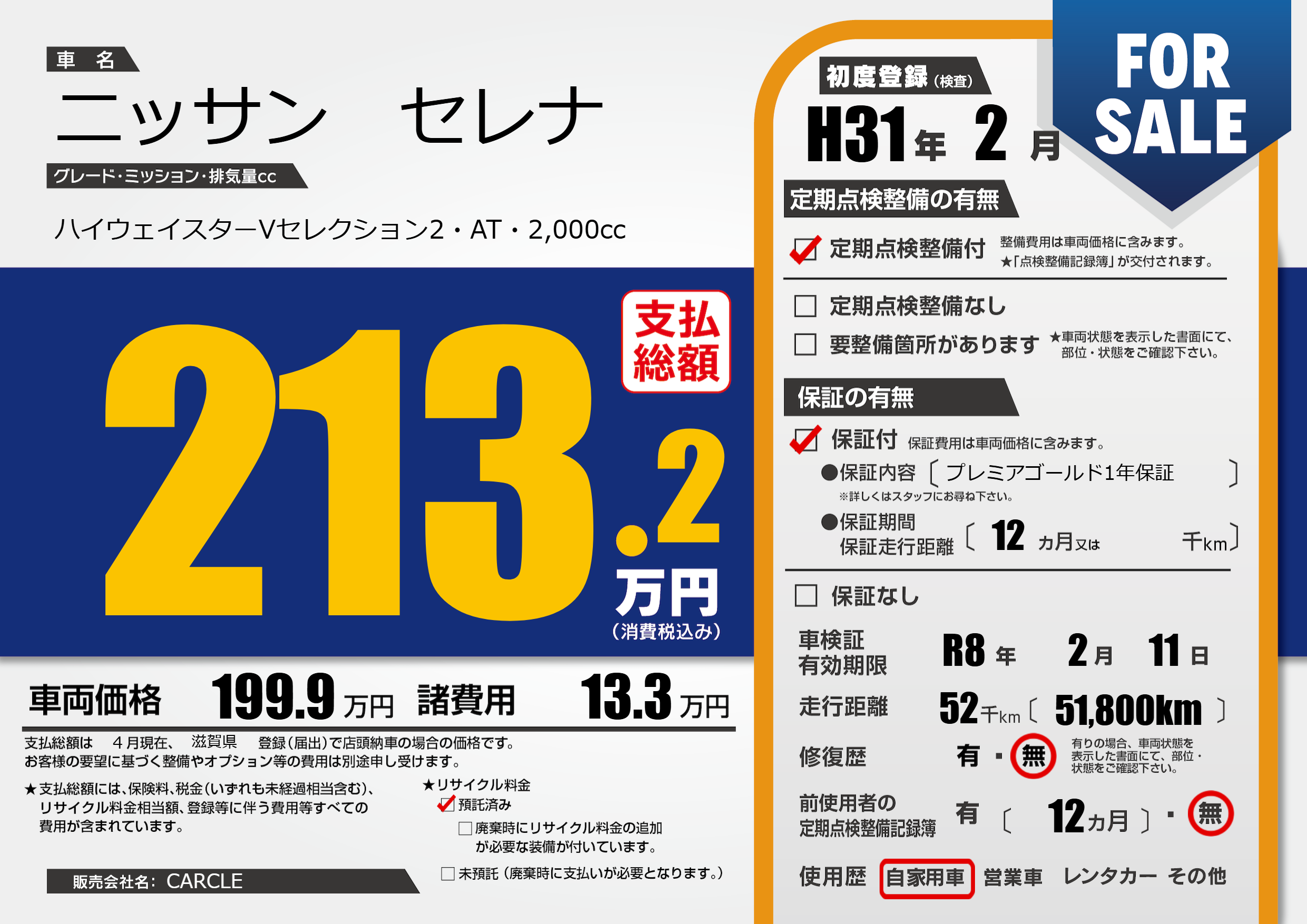 | 車名 | ニッサン セレナ | グレード ミッション 排気量 |