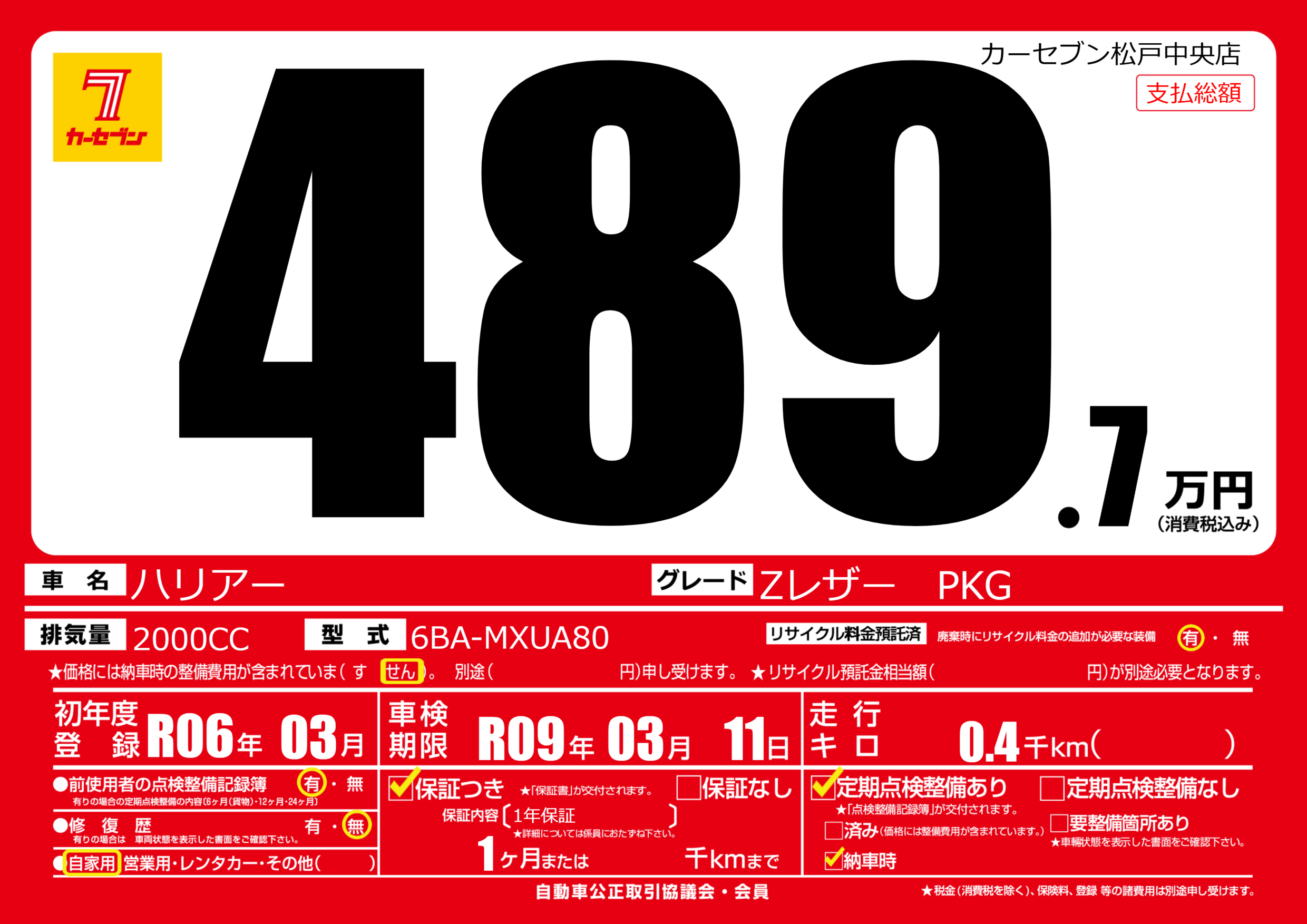 | 走行キロ | - | 初年度登録 | R06年03月 |
