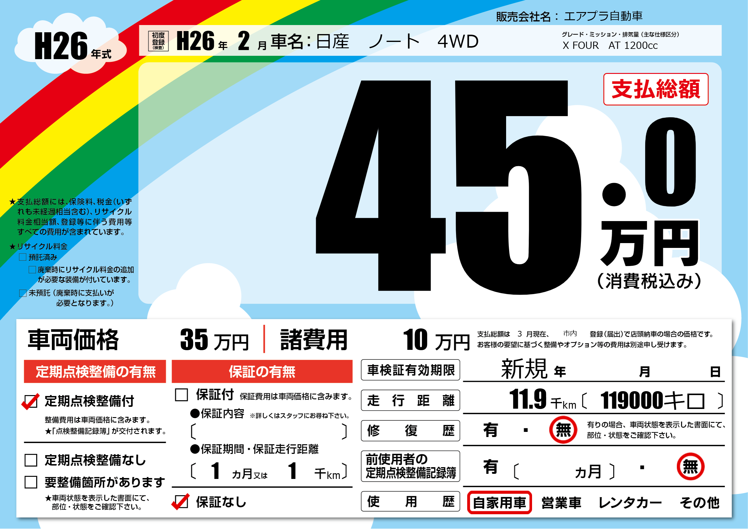 | 車名 | 日産 ノート 4WD | グレード ミッション 排気量 |