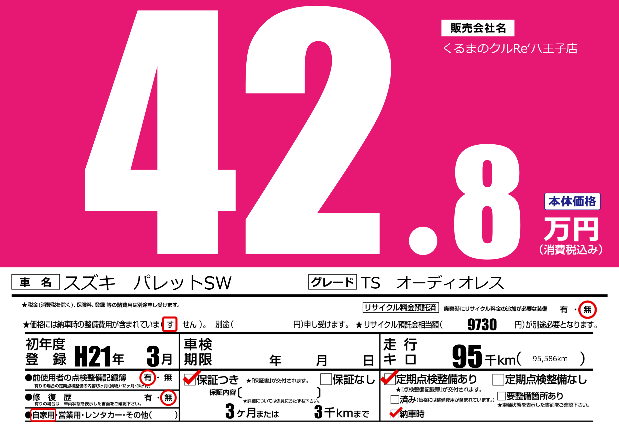 | 走行キロ | 9.5万km | 初年度登録 | H21年3月 |