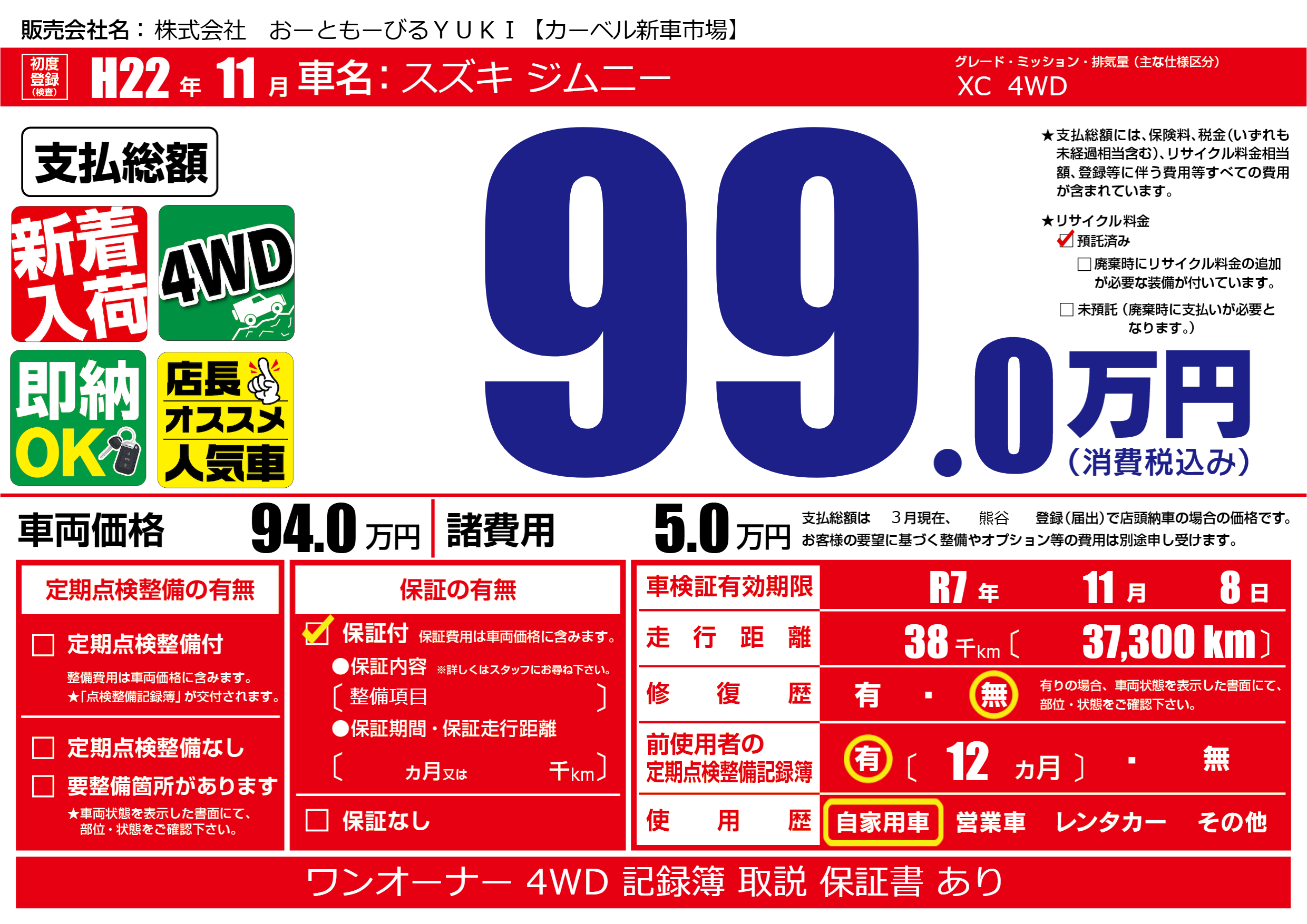 | 走行キロ | 3.8万km | 初年度登録 | H22年11月 |