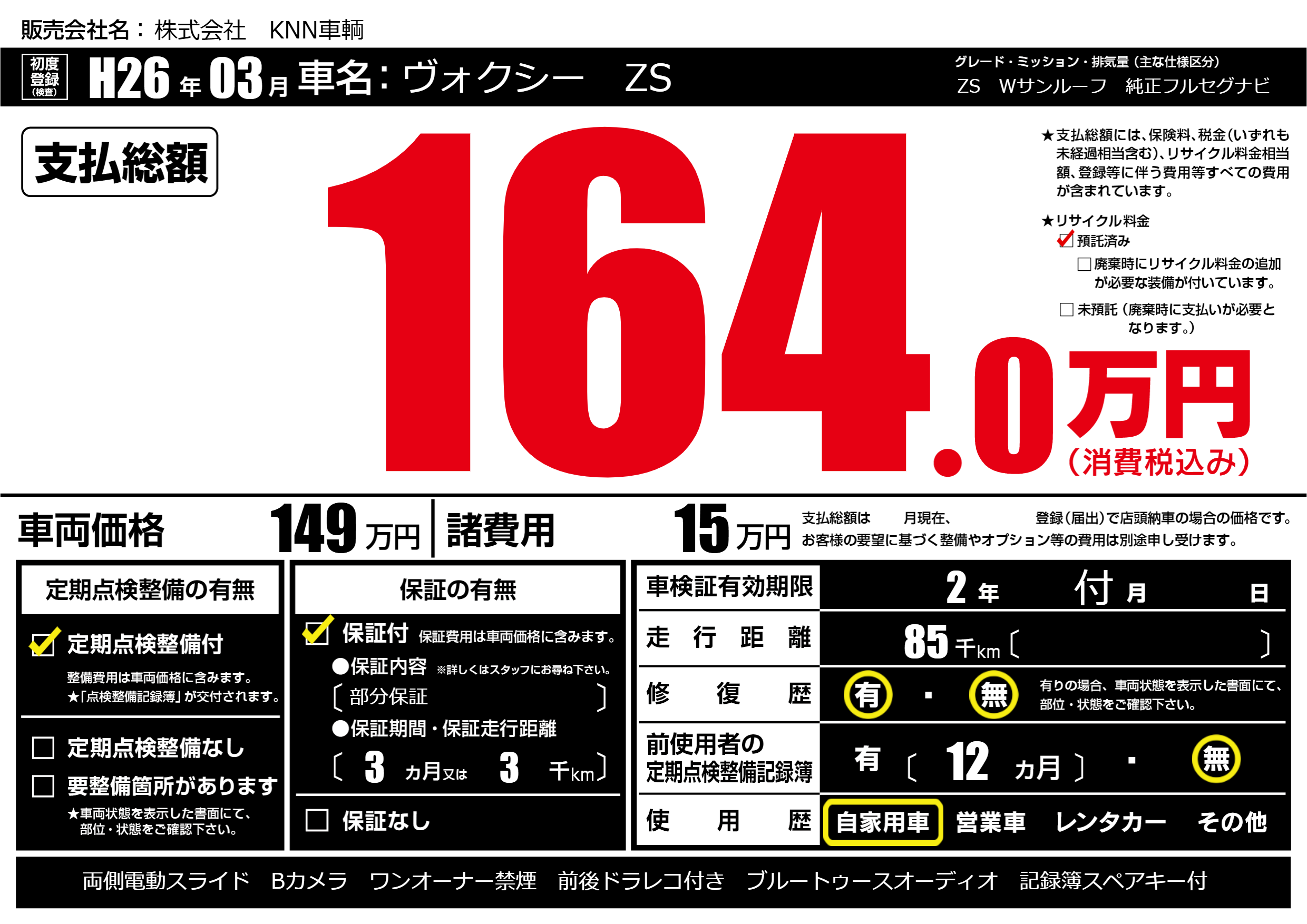 | 車名 | ヴォクシー ZS | グレード ミッション 排気量 |