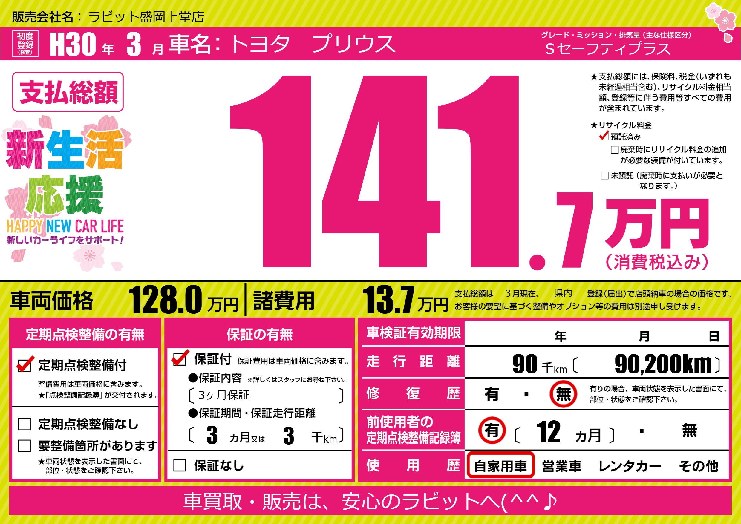 | 走行キロ | 9万km | 初年度登録 | H30年3月 |