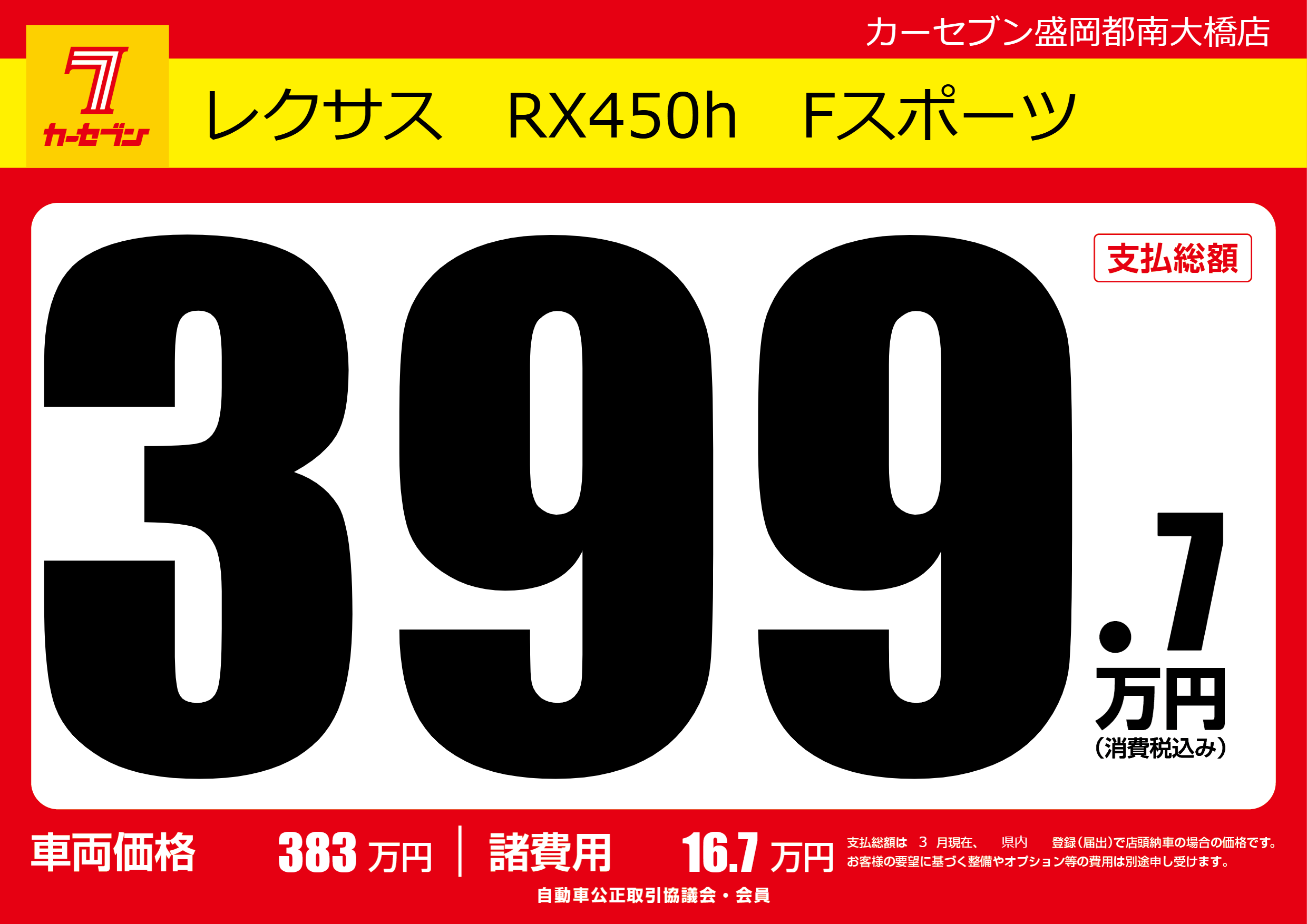 | 車名 | レクサス RX450h Fスポーツ | グレード ミッション 排気量 |