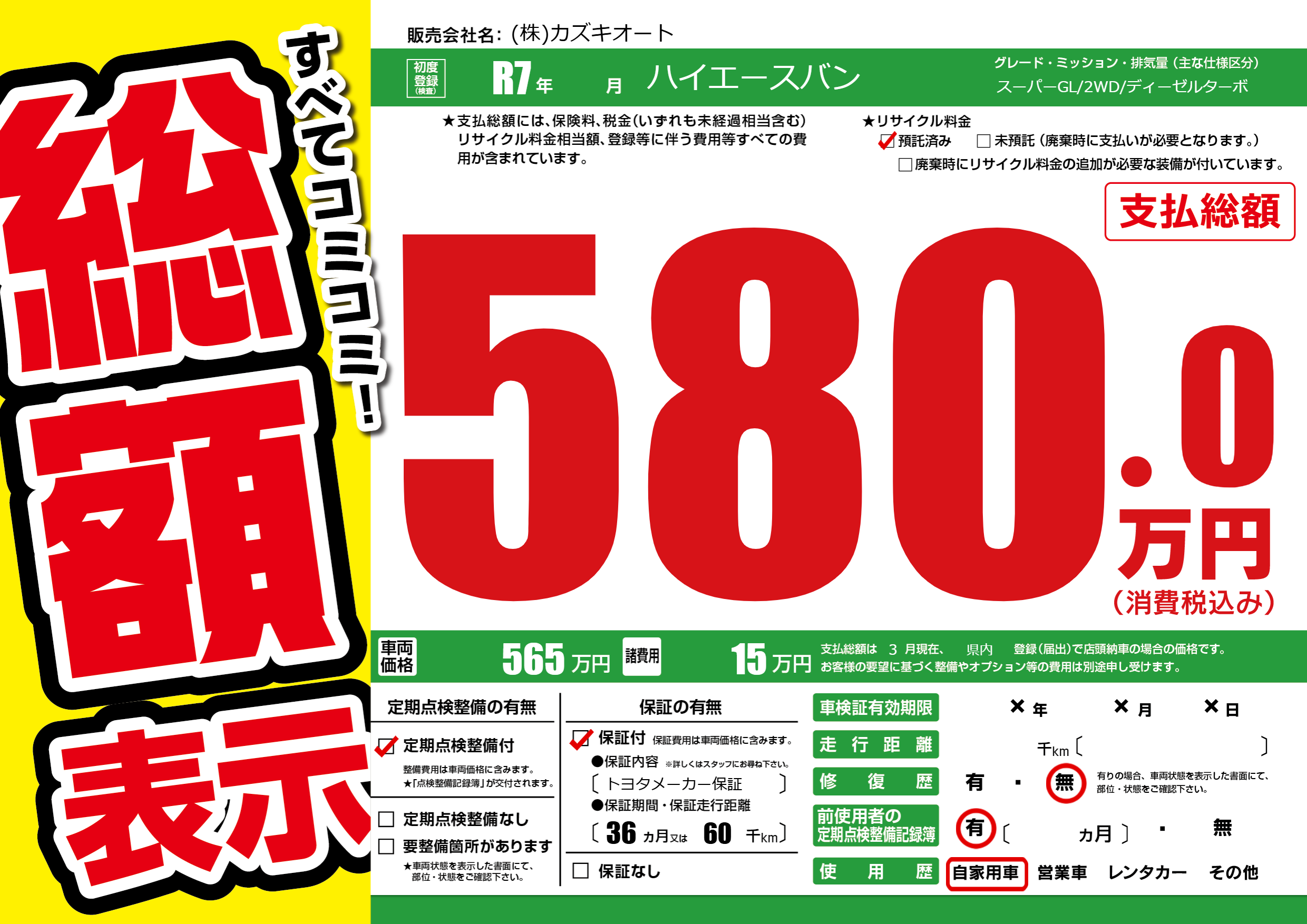 | 車名 | ハイエースバン | グレード ミッション 排気量 |
