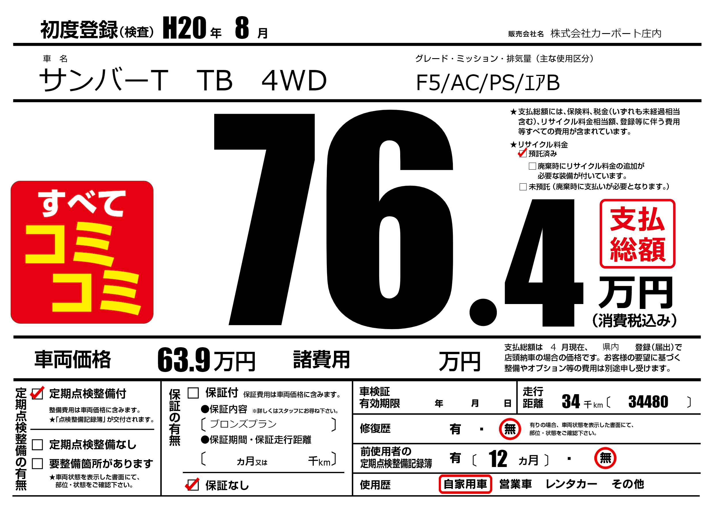 | 車名 | サンバーT TB 4WD | グレード ミッション 排気量 |
