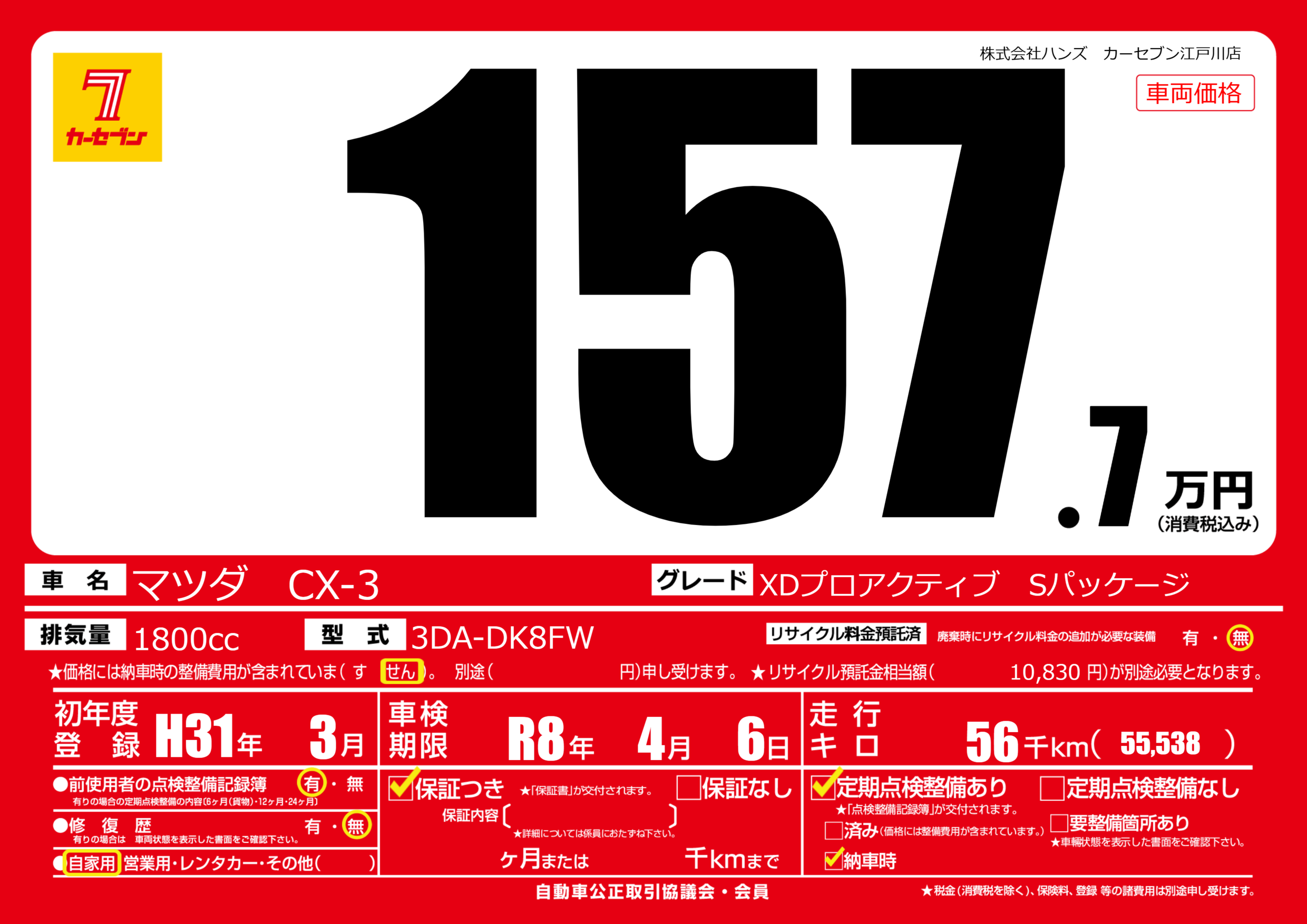 | 車名 | マツダ CX-3 | グレード ミッション 排気量 |