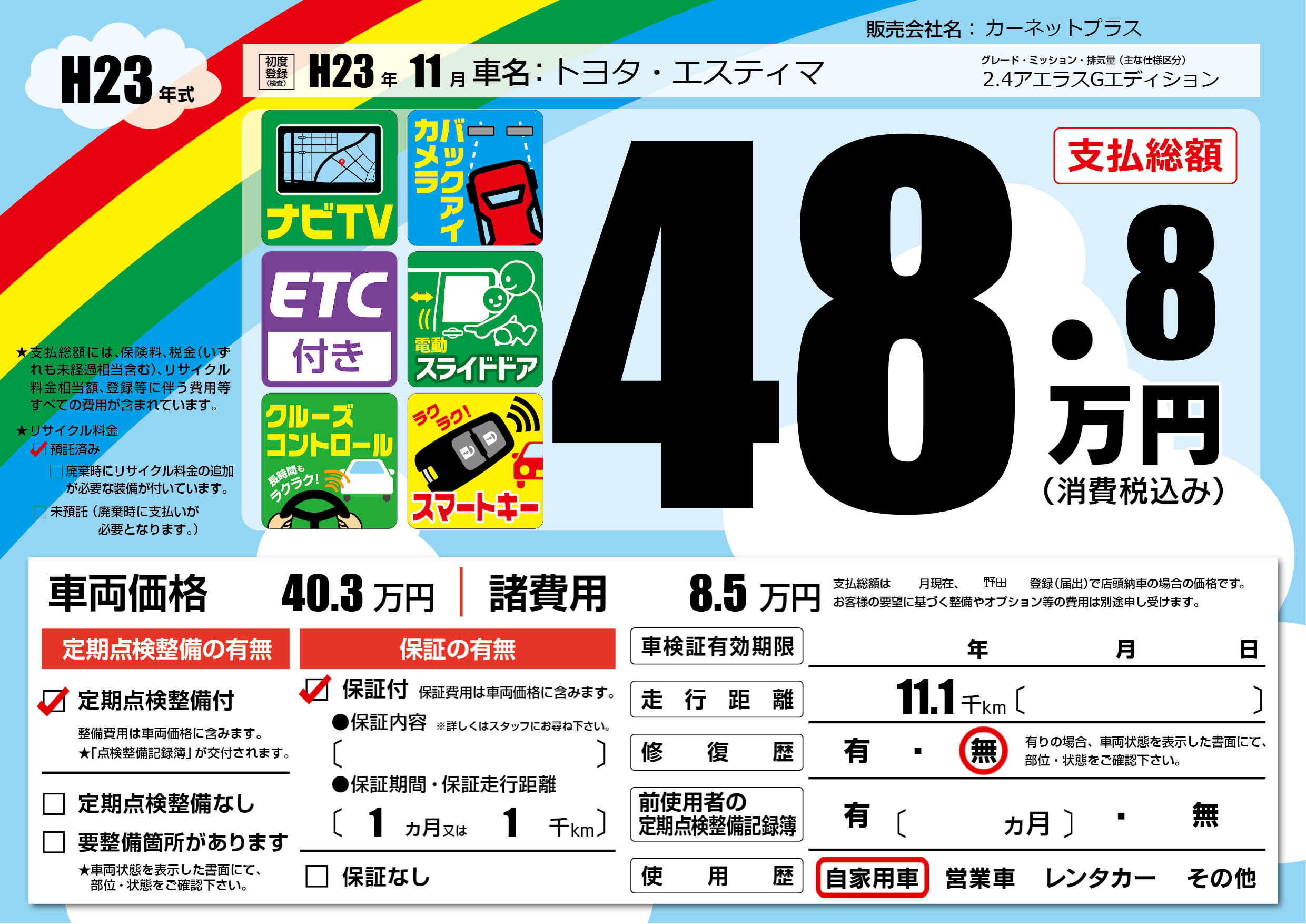 | 走行キロ | 1.1万km | 初年度登録 | H23年11月 |