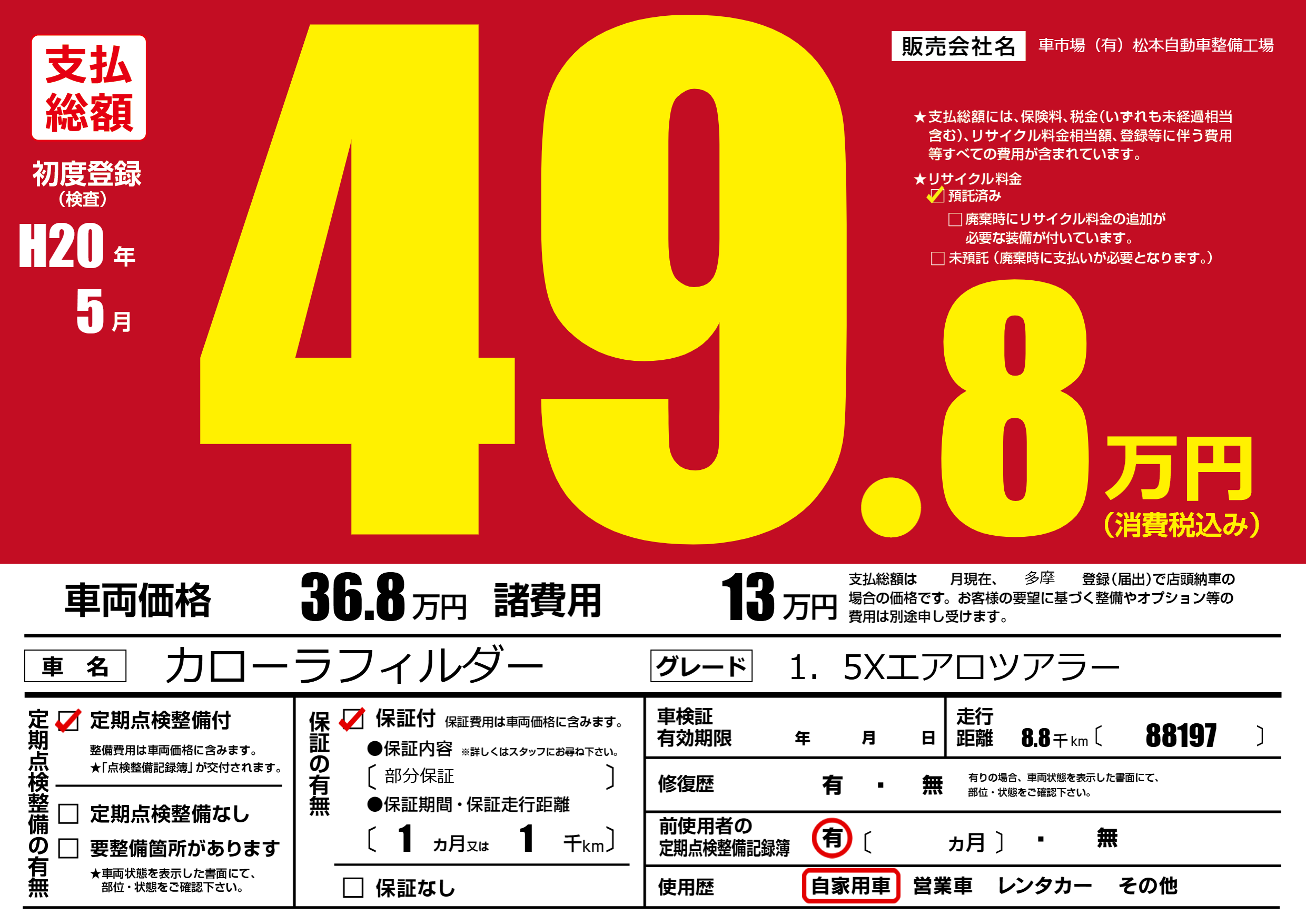 | 走行キロ | 0.8万km | 初年度登録 | H20年5月 |