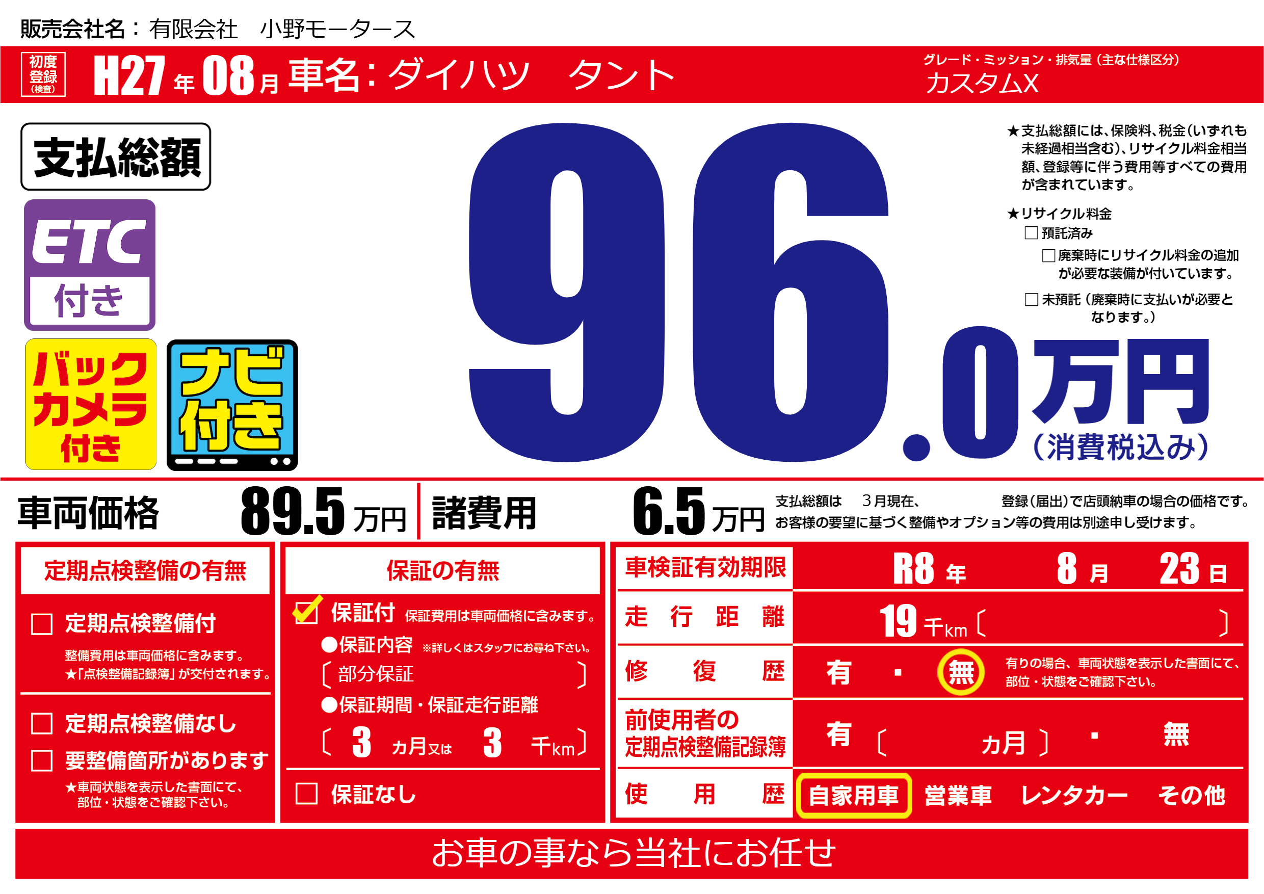 | 車名 | ダイハツ タント | グレード ミッション 排気量 |