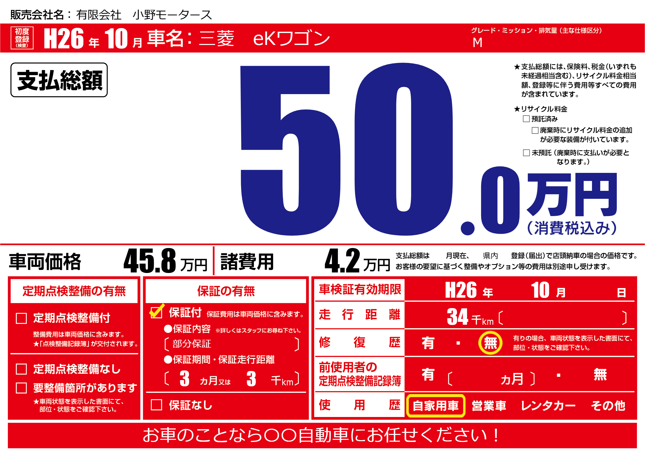 | 車名 | 三菱 eKワゴン | グレード ミッション 排気量 |