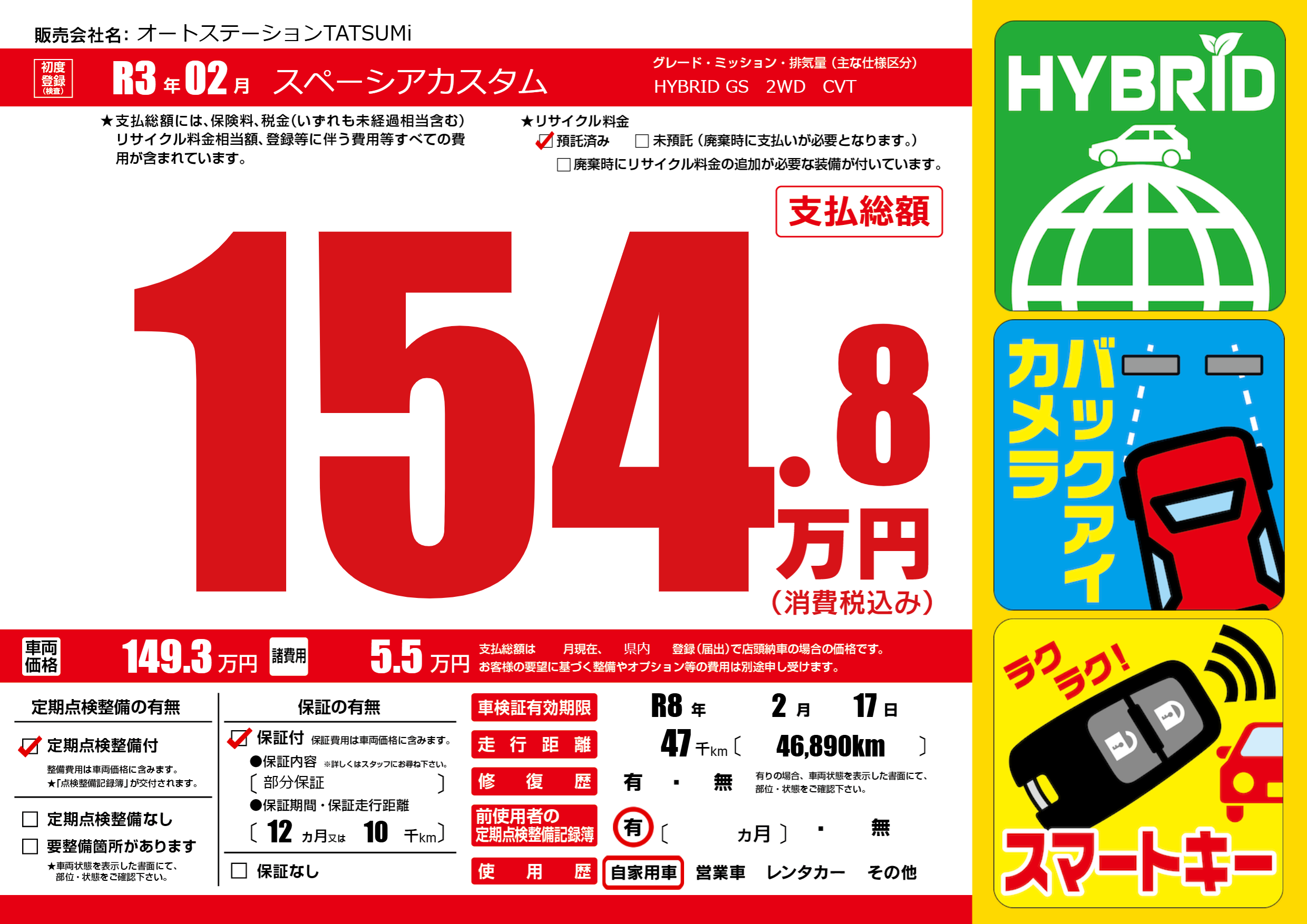 | 車名 | スペーシアカスタム | グレード ミッション 排気量 |