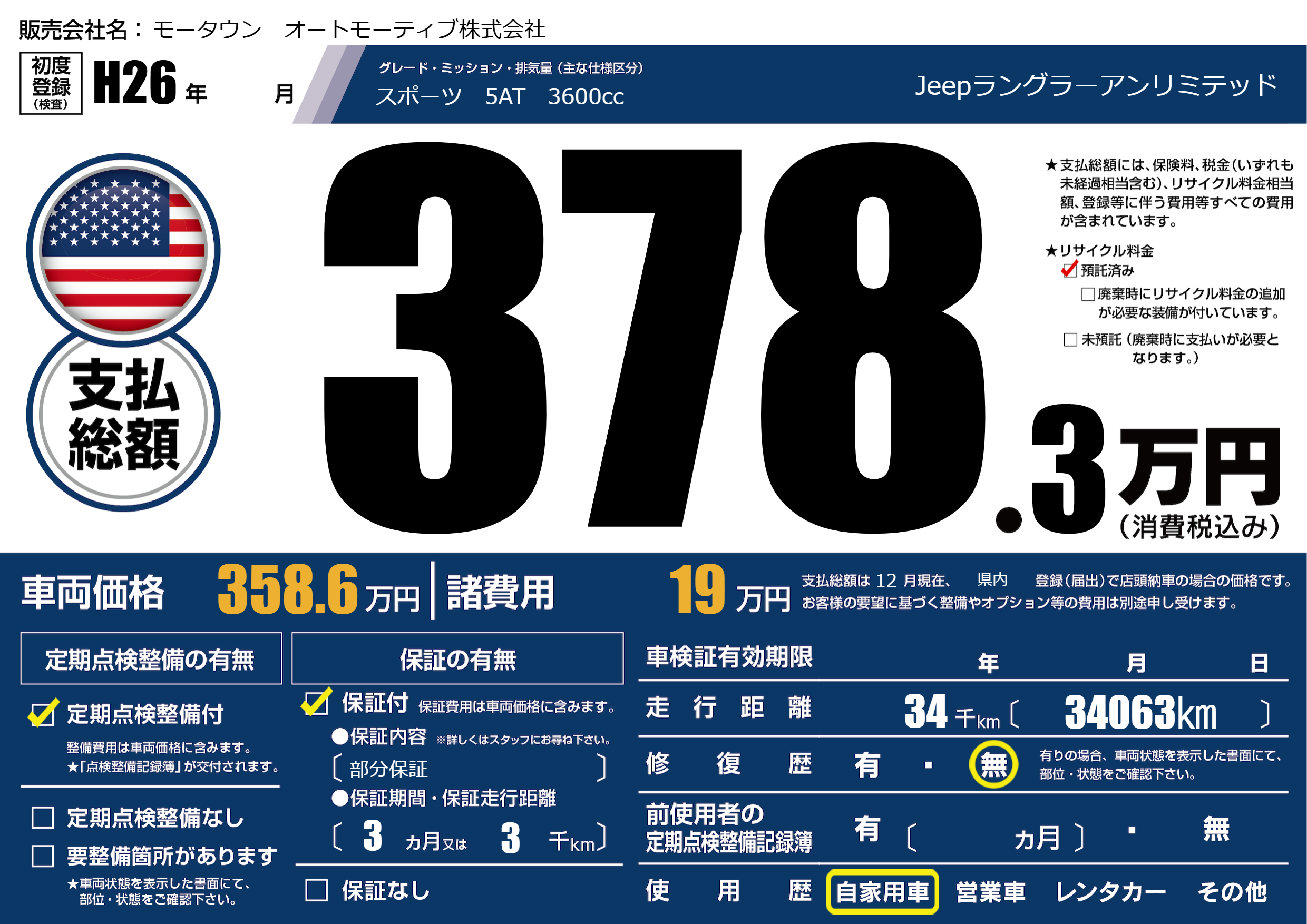 | 車名 | Jeepラングラーアンリミテッド | グレード ミッション 排気量 |