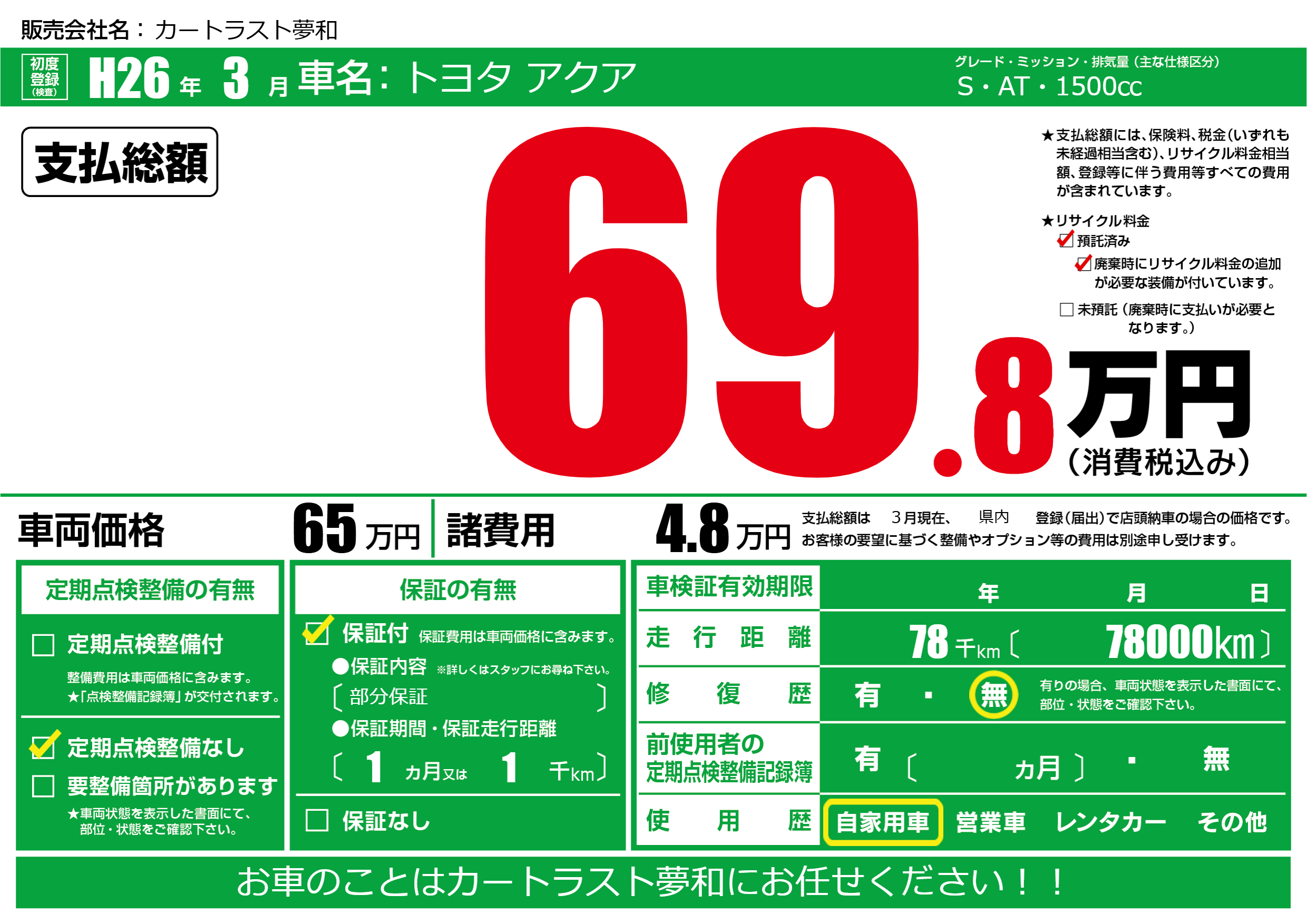 | 車名 | トヨタ アクア | グレード ミッション 排気量 |