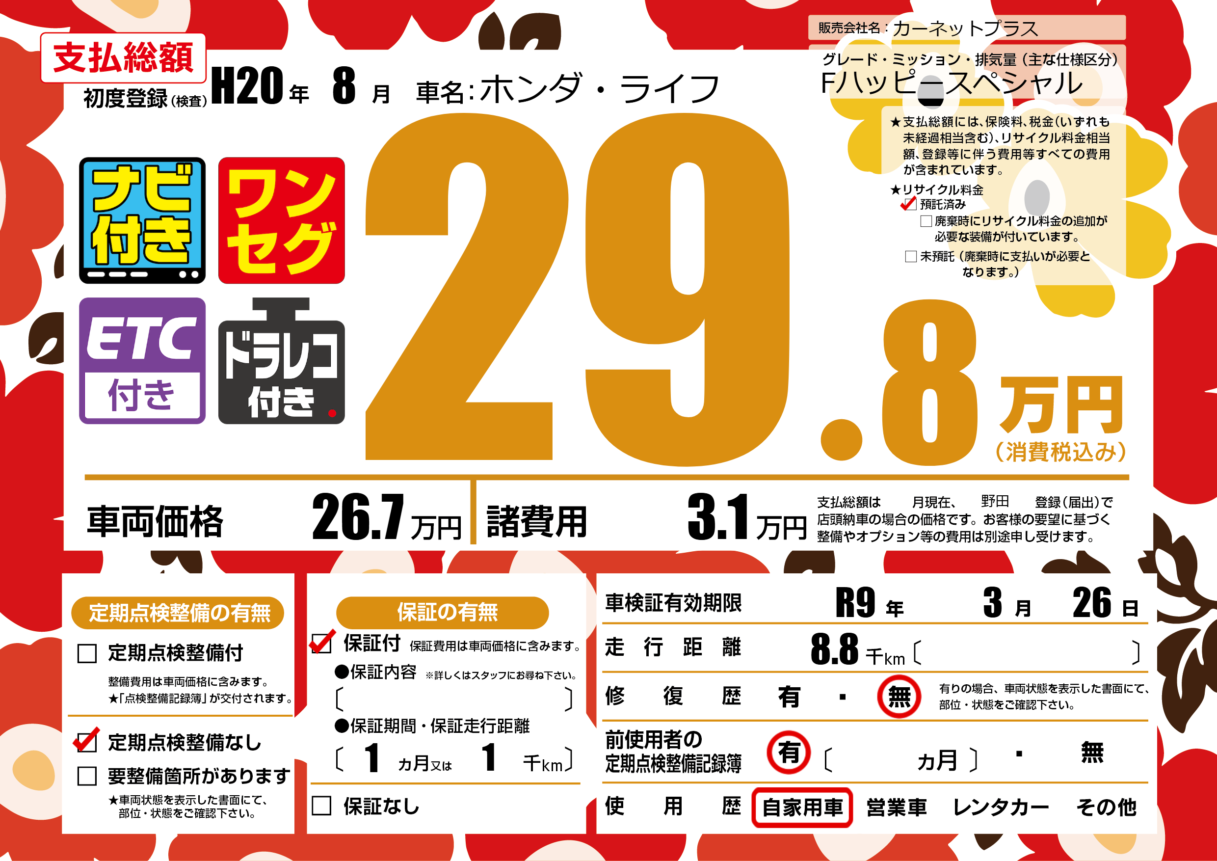 | 車名 | ホンダ・ライフ | グレード ミッション 排気量 |