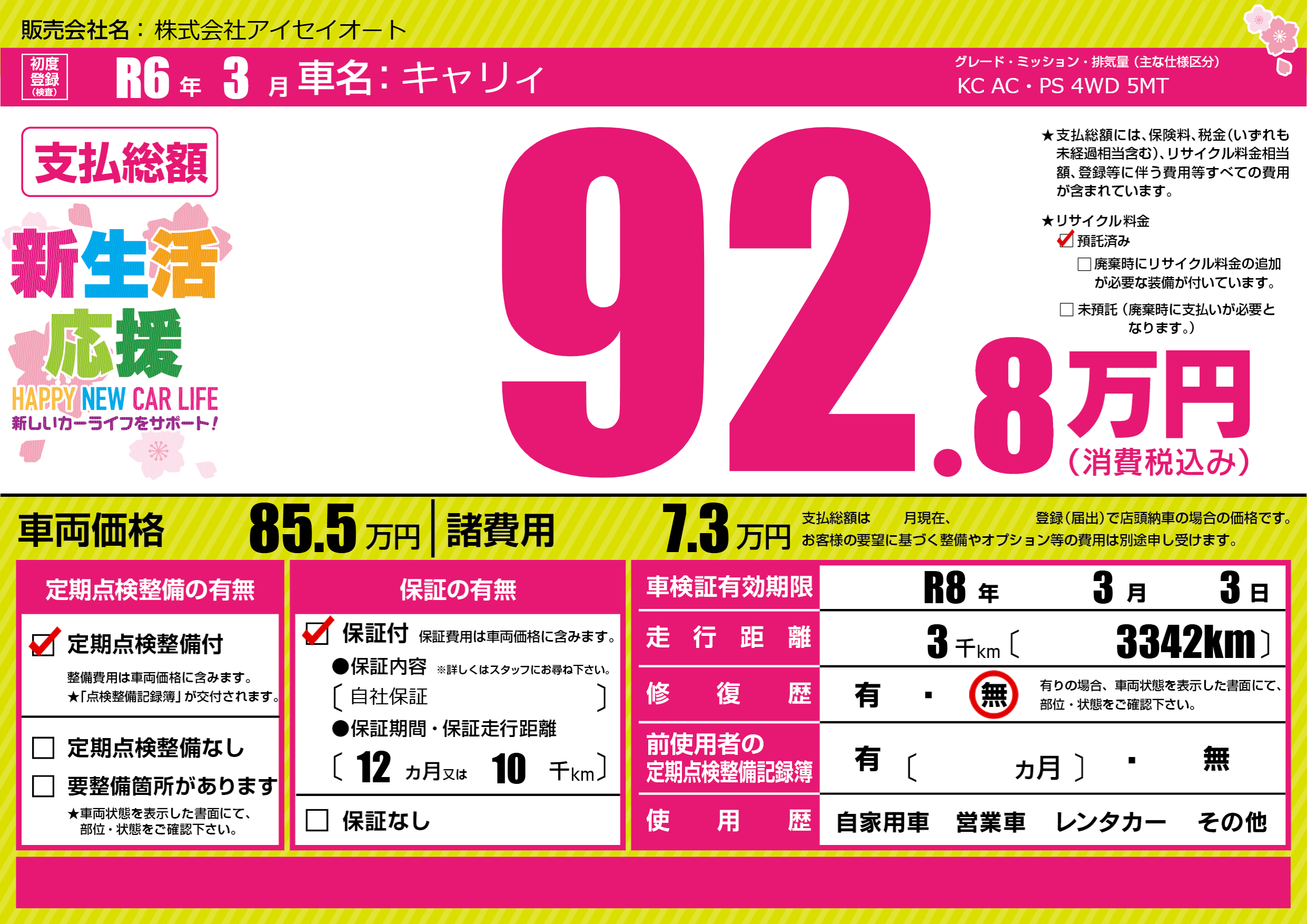 | 走行キロ | 0.3万km | 初年度登録 | R6年3月 |