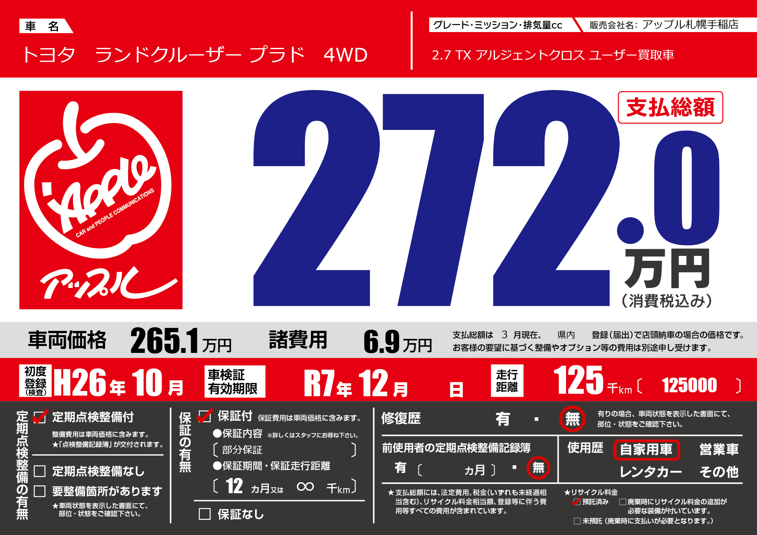 | 車名 | トヨタ ランドクルーザー プラド 4WD | グレード ミッション 排気量 |