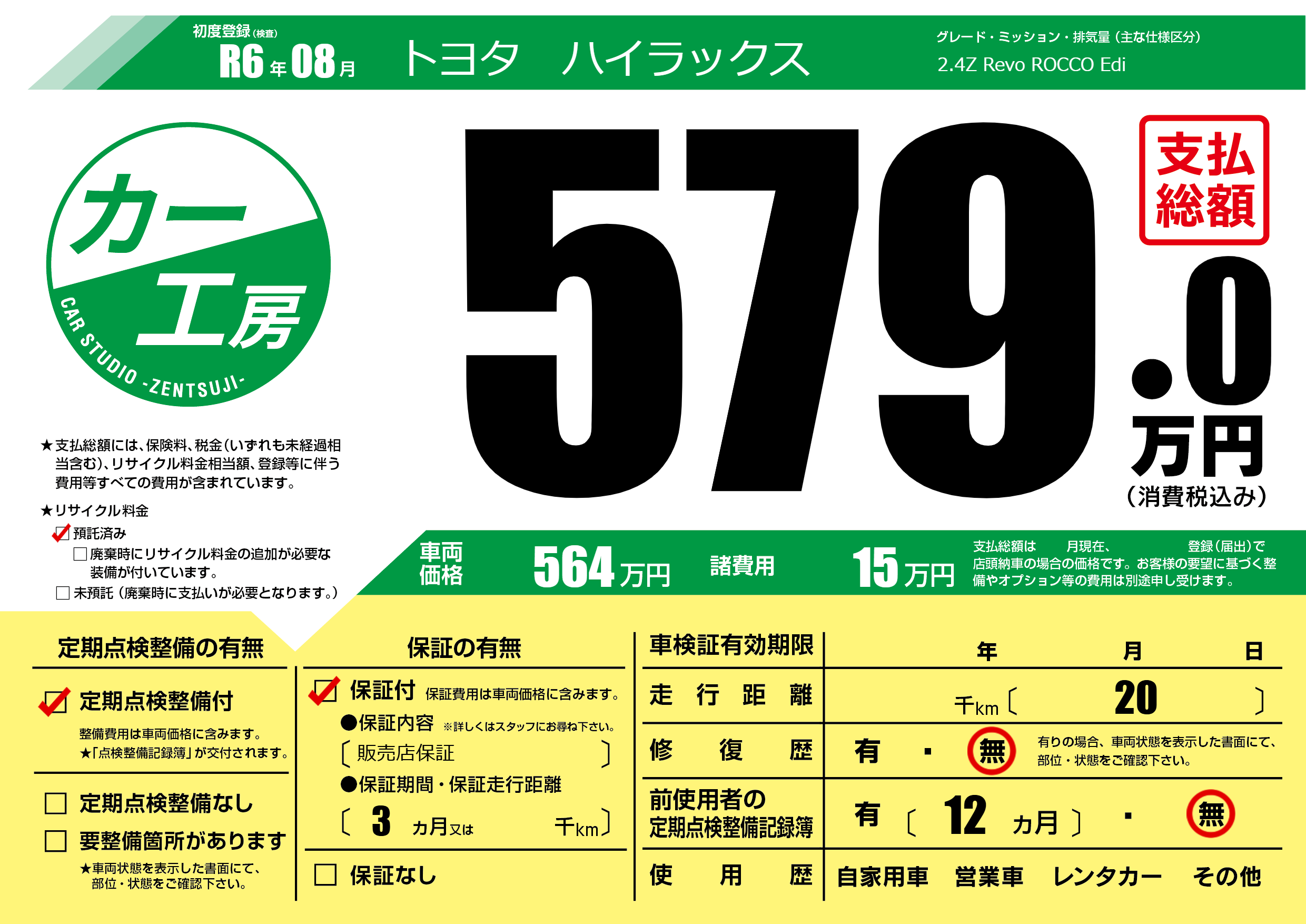| 車名 | トヨタ ハイラックス | グレード ミッション 排気量 |