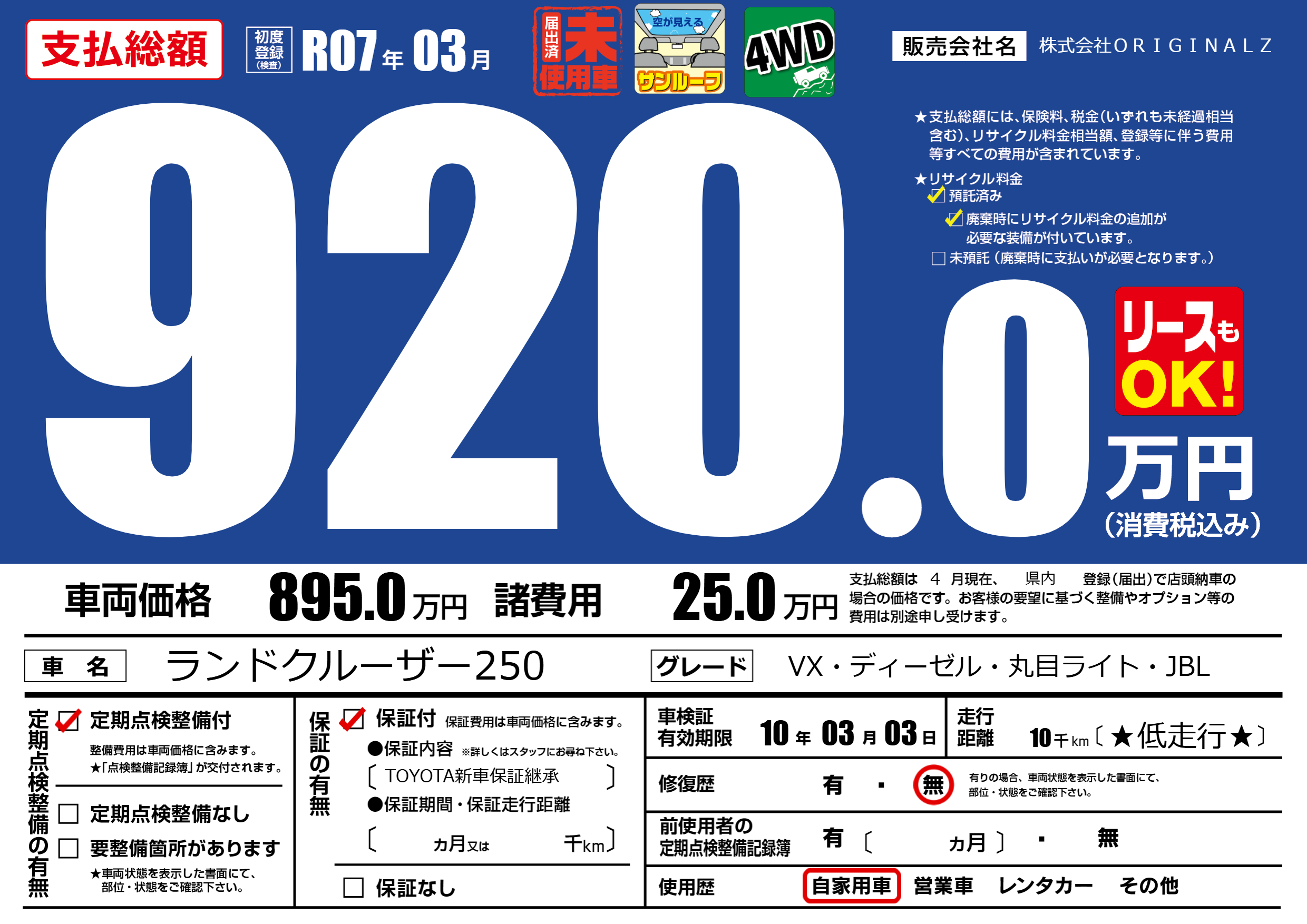 | 車名 | ランドクルーザー250 | グレード ミッション 排気量 |
