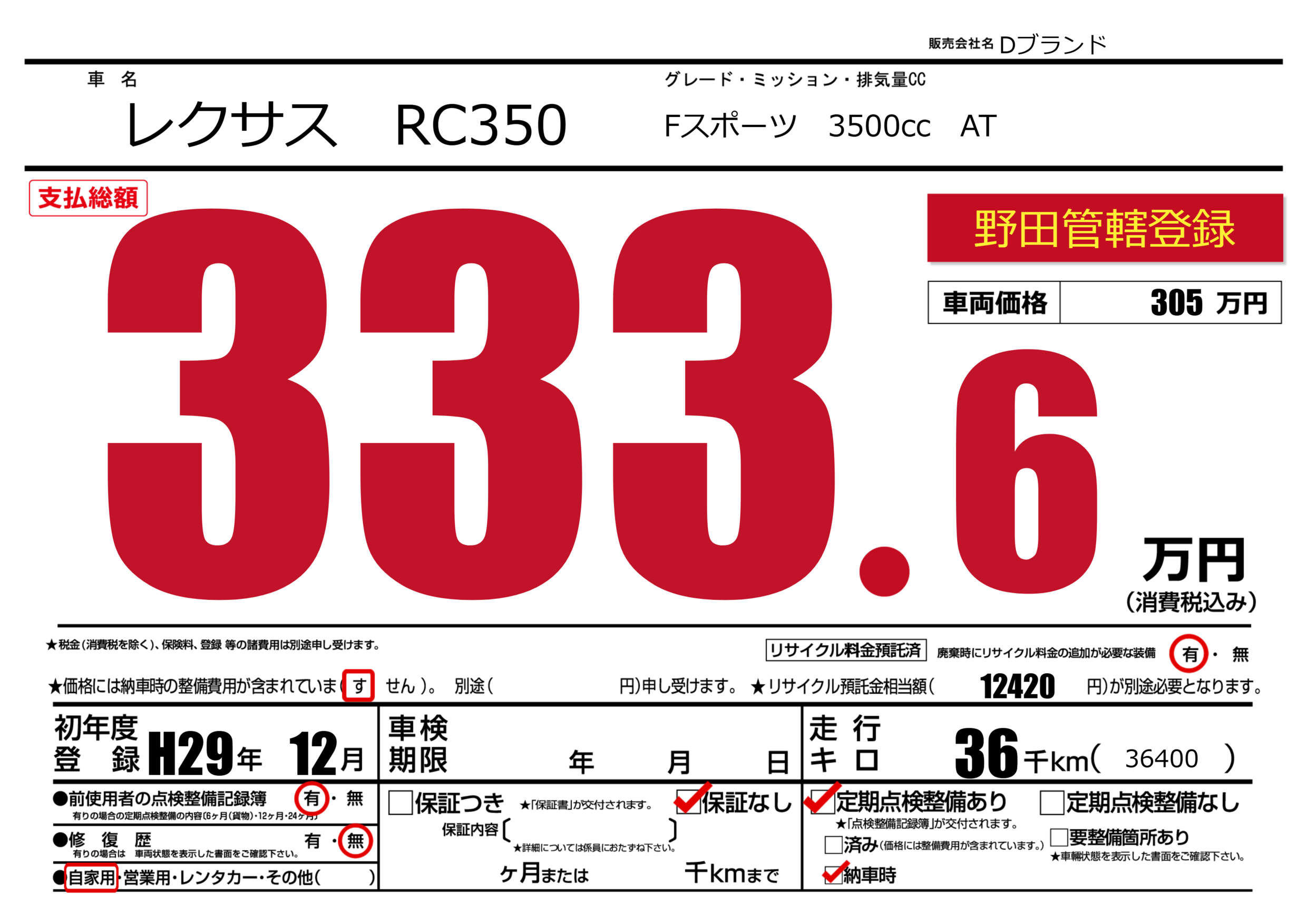 | 車名 | レクサス RC350 | グレード ミッション 排気量 |