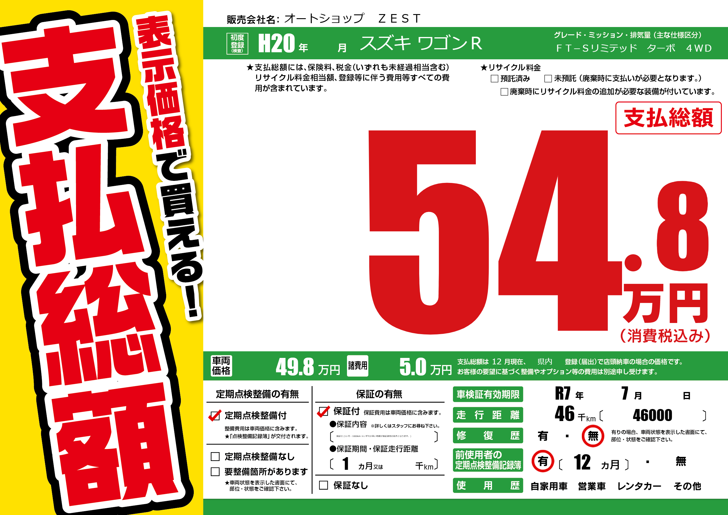 | 車名 | スズキ ワゴンR | グレード ミッション 排気量 |
