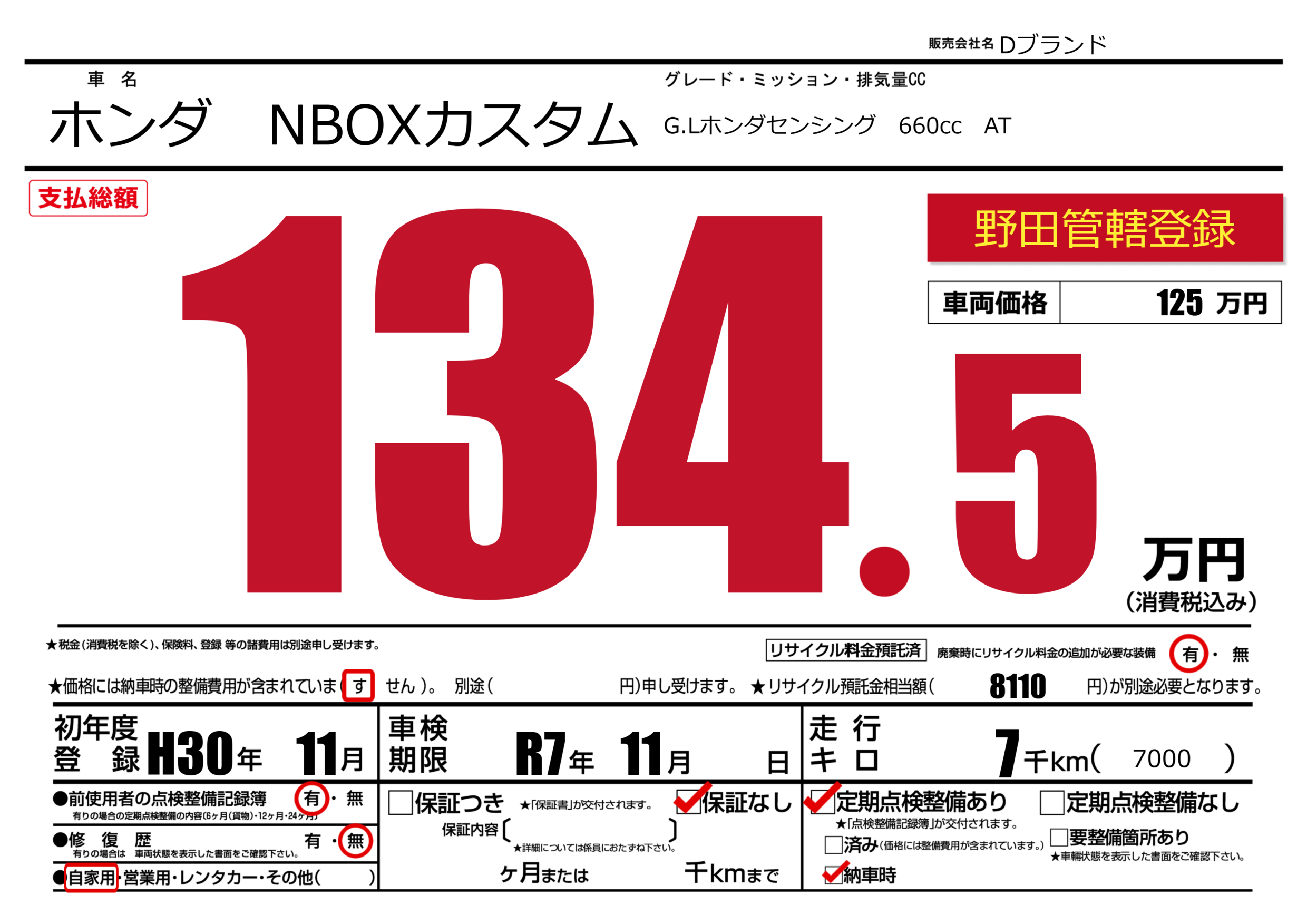 | 走行キロ | 0.7万km | 初年度登録 | H30年11月 |