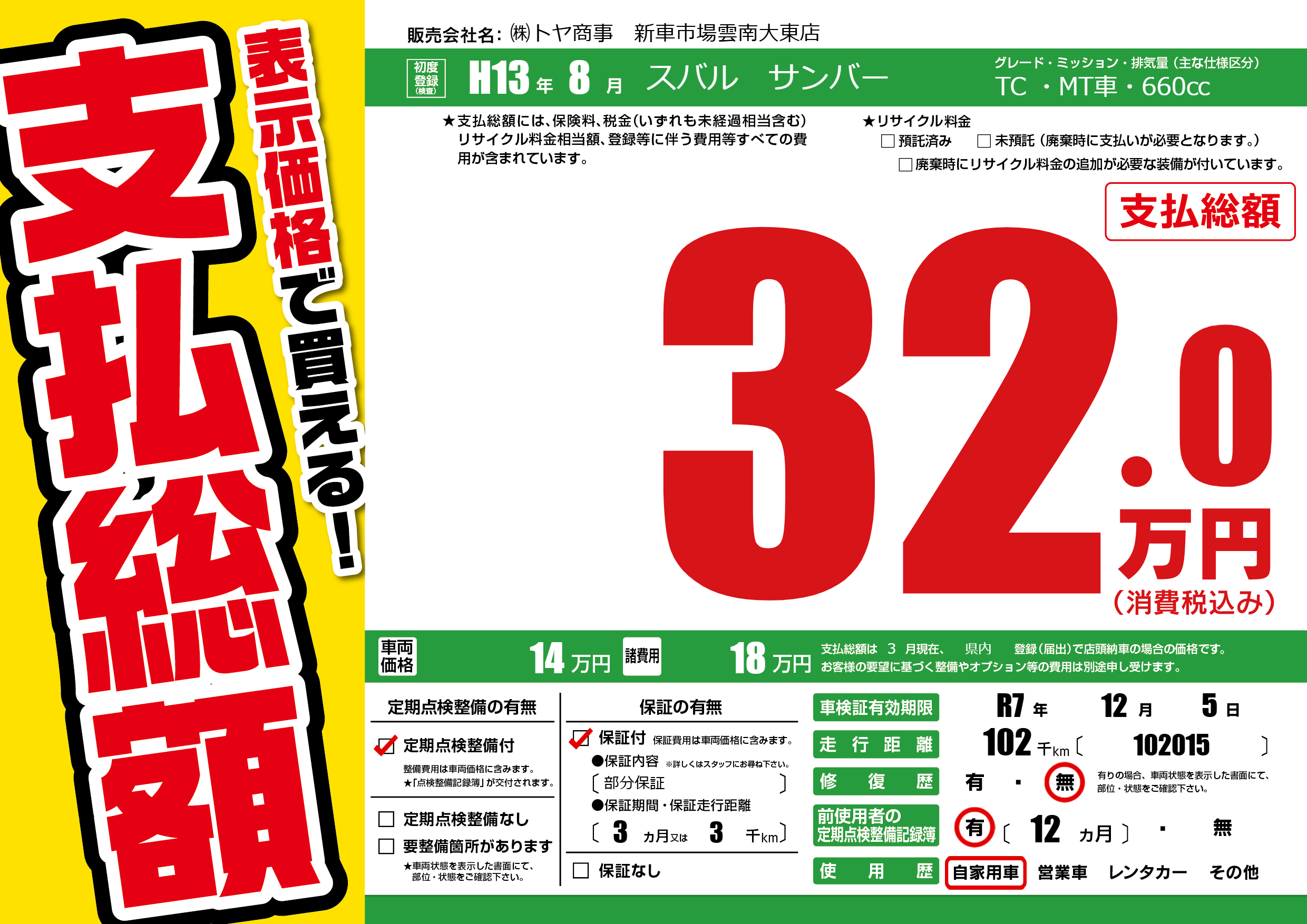 | 車名 | スバル サンバー | グレード ミッション 排気量 |
