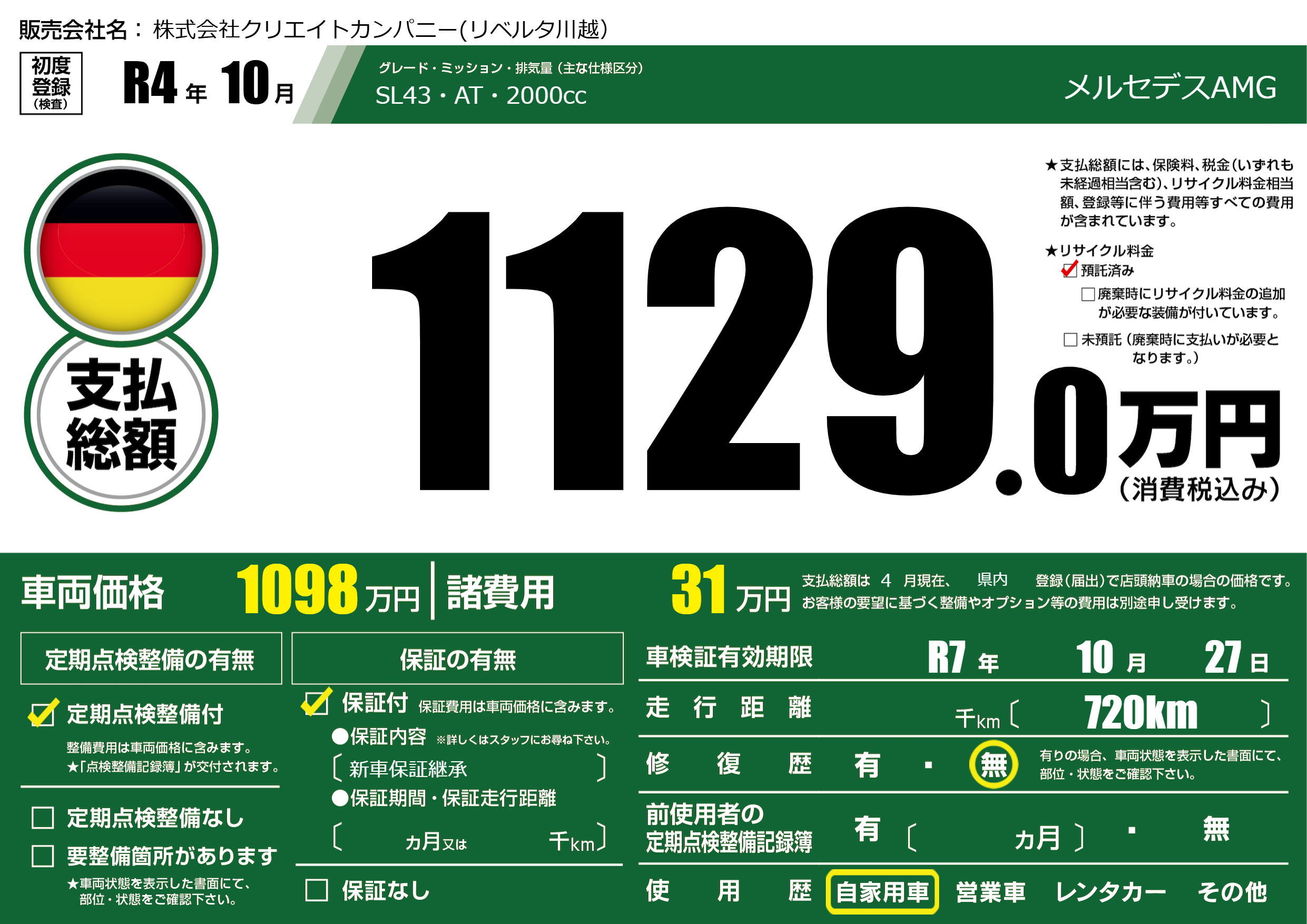 | 走行キロ | - | 初年度登録 | R4年10月 |